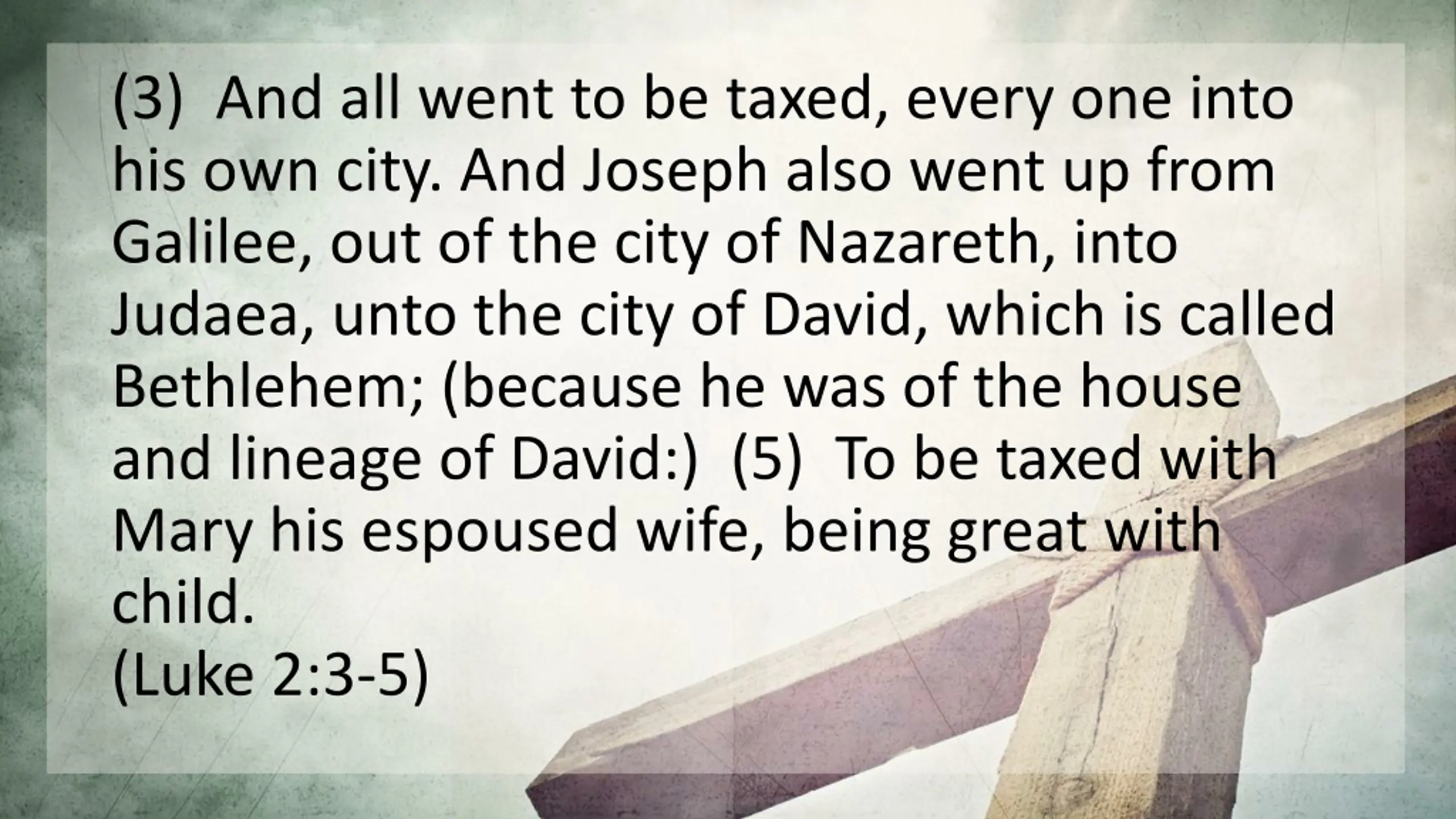 (3) And all went to be taxed, every one into his own city. And Joseph also went up from Galilee, out of the city of Nazareth, into Judaea, unto the city of David, which is called Bethlehem; (because he was of the house and lineage of David:) (5) To be taxed with Mary his espoused wife, being great with child. (Luke 2:3-5)