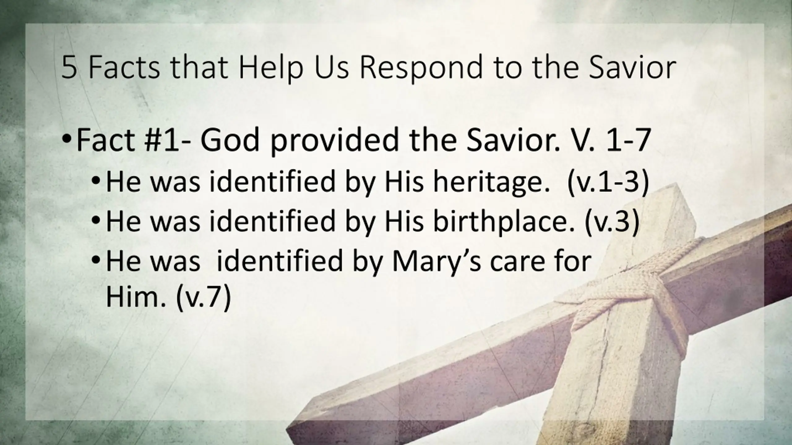 5 Facts that Help Us Respond to the Savior Fact #1- God provided the Savior. V. 1-7 He was identified by His heritage. (v.1-3) He was identified by His birthplace. (v.3) He was identified by Mary s care for Him. (v.7)