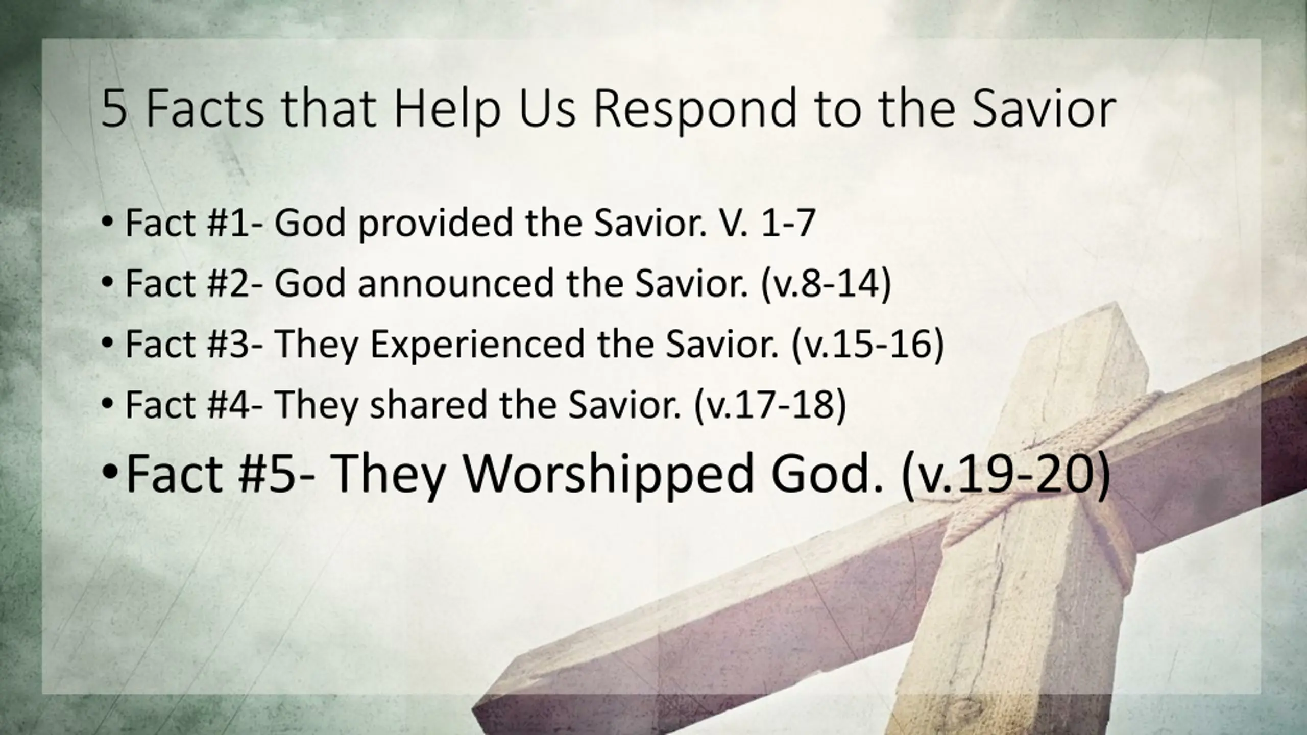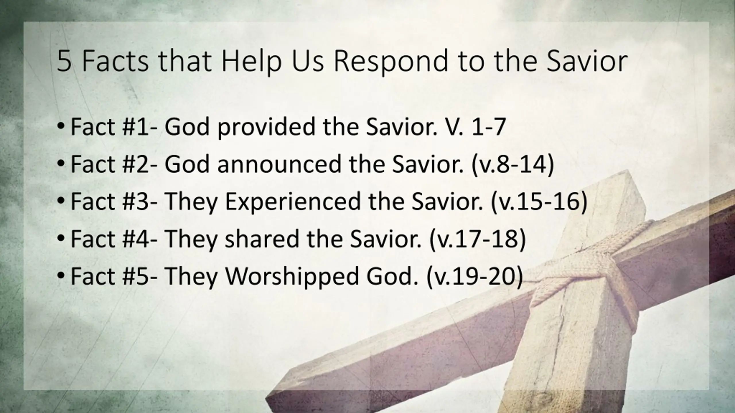 5 Facts that Help Us Respond to the Savior Fact #1- God provided the Savior. V. 1-7 Fact #2- God announced the Savior. (v.8-14) Fact #3- They Experienced the Savior. (v.15-16) Fact #4- They shared the Savior. (v.17-18) Fact #5- They Worshipped God. (v.19-20)