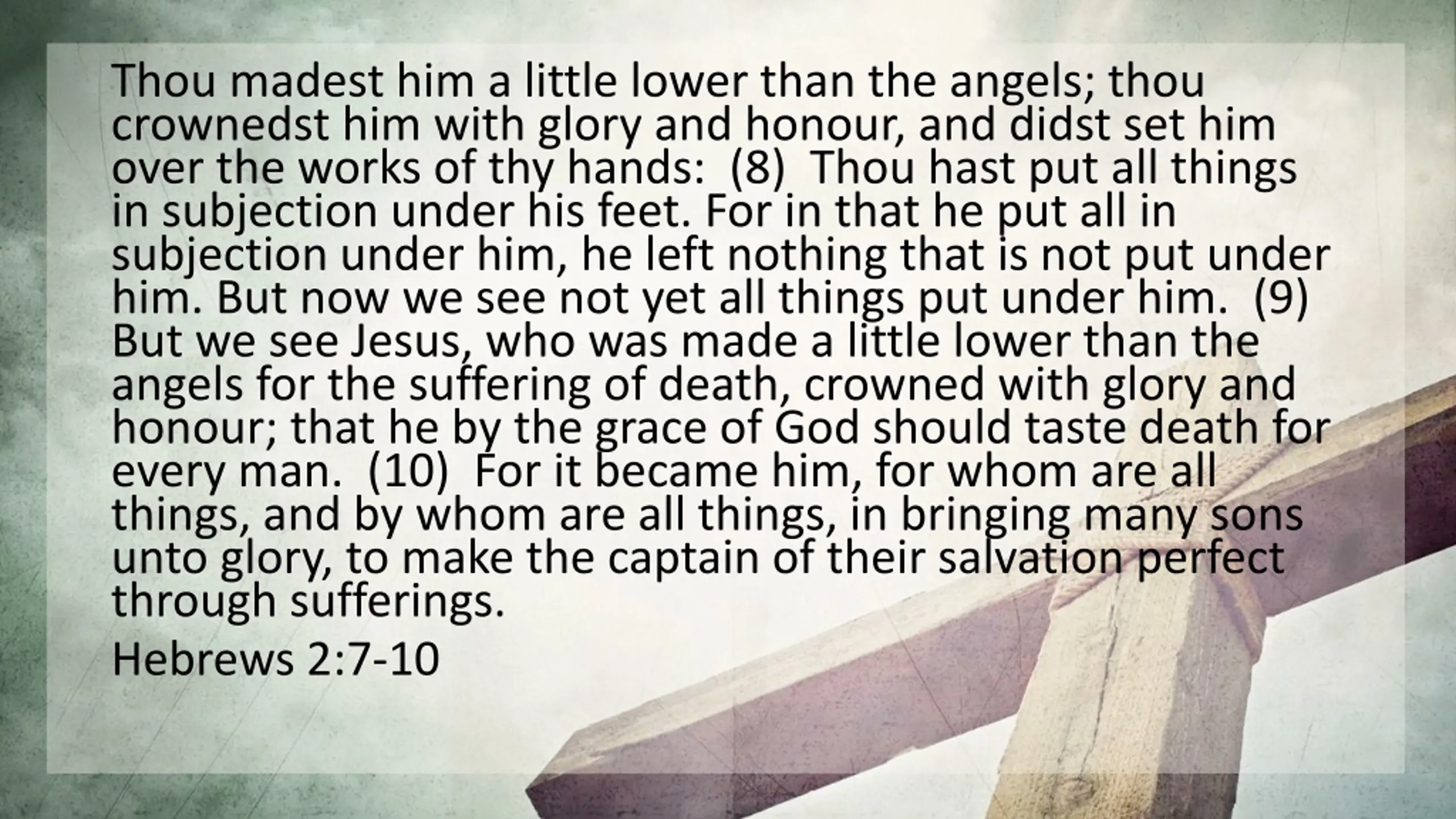 Thou madest him a little lower than the angels; thou crownedst him with glory and honour, and didst set him over the works of thy hands: (8) Thou hast put all things in subjection under his feet. For in that he put all in subjection under him, he left nothing that is not put under him. But now we see not yet all things put under him. (9) But we see Jesus, who was made a little lower than the angels for the suffering of death, crowned with glory and honour; that he by the grace of God should taste death for every man. (10) For it became him, for whom are all things, and by whom are all things, in bringing many sons unto glory, to make the captain of their salvation perfect through sufferings. Hebrews 2:7-10