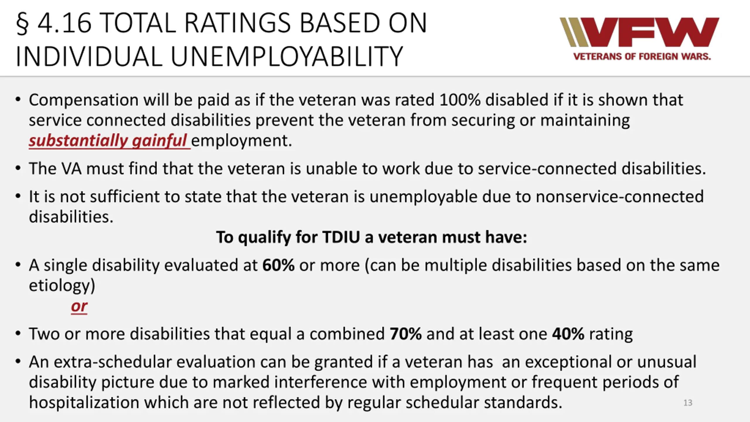 4.16 TOTAL RATINGS BASED ON INDIVIDUAL UNEMPLOYABILITY Compensation will be paid as if the veteran was rated 100% disabled if it is shown that service connected disabilities prevent the veteran from securing or maintaining substantially gainful employment. The VA must find that the veteran is unable to work due to service-connected disabilities. It is not sufficient to state that the veteran is unemployable due to nonservice-connected disabilities. To qualify for TDIU a veteran must have: A single disability evaluated at 60% or more (can be multiple disabilities based on the same etiology) or Two or more disabilities that equal a combined 70% and at least one 40% rating An extra-schedular evaluation can be granted if a veteran has an exceptional or unusual disability picture due to marked interference with employment or frequent periods of hospitalization which are not reflected by regular schedular standards. 13