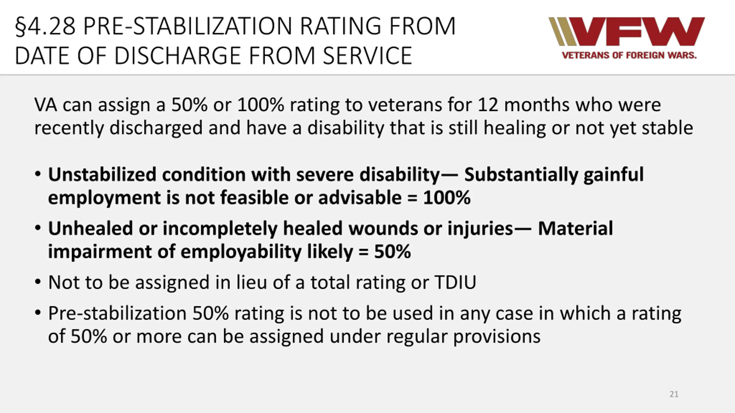 4.28 PRE-STABILIZATION RATING FROM DATE OF DISCHARGE FROM SERVICE VA can assign a 50% or 100% rating to veterans for 12 months who were recently discharged and have a disability that is still healing or not yet stable Unstabilized condition with severe disability Substantially gainful employment is not feasible or advisable = 100% Unhealed or incompletely healed wounds or injuries Material impairment of employability likely = 50% Not to be assigned in lieu of a total rating or TDIU Pre-stabilization 50% rating is not to be used in any case in which a rating of 50% or more can be assigned under regular provisions 21