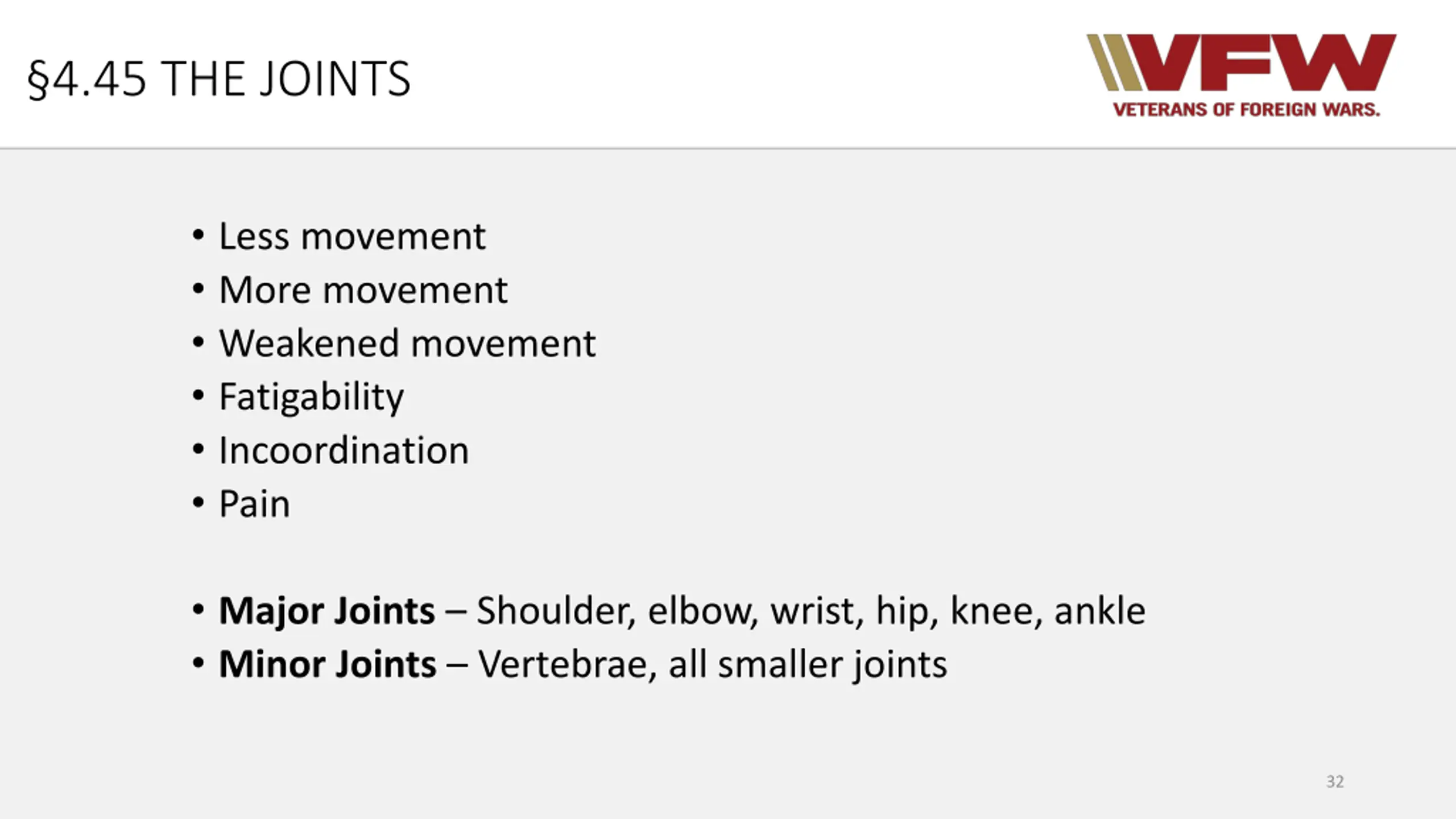 4.45 THE JOINTS Less movement More movement Weakened movement Fatigability Incoordination Pain Major Joints Shoulder, elbow, wrist, hip, knee, ankle MinorJoints Vertebrae, all smaller joints 32