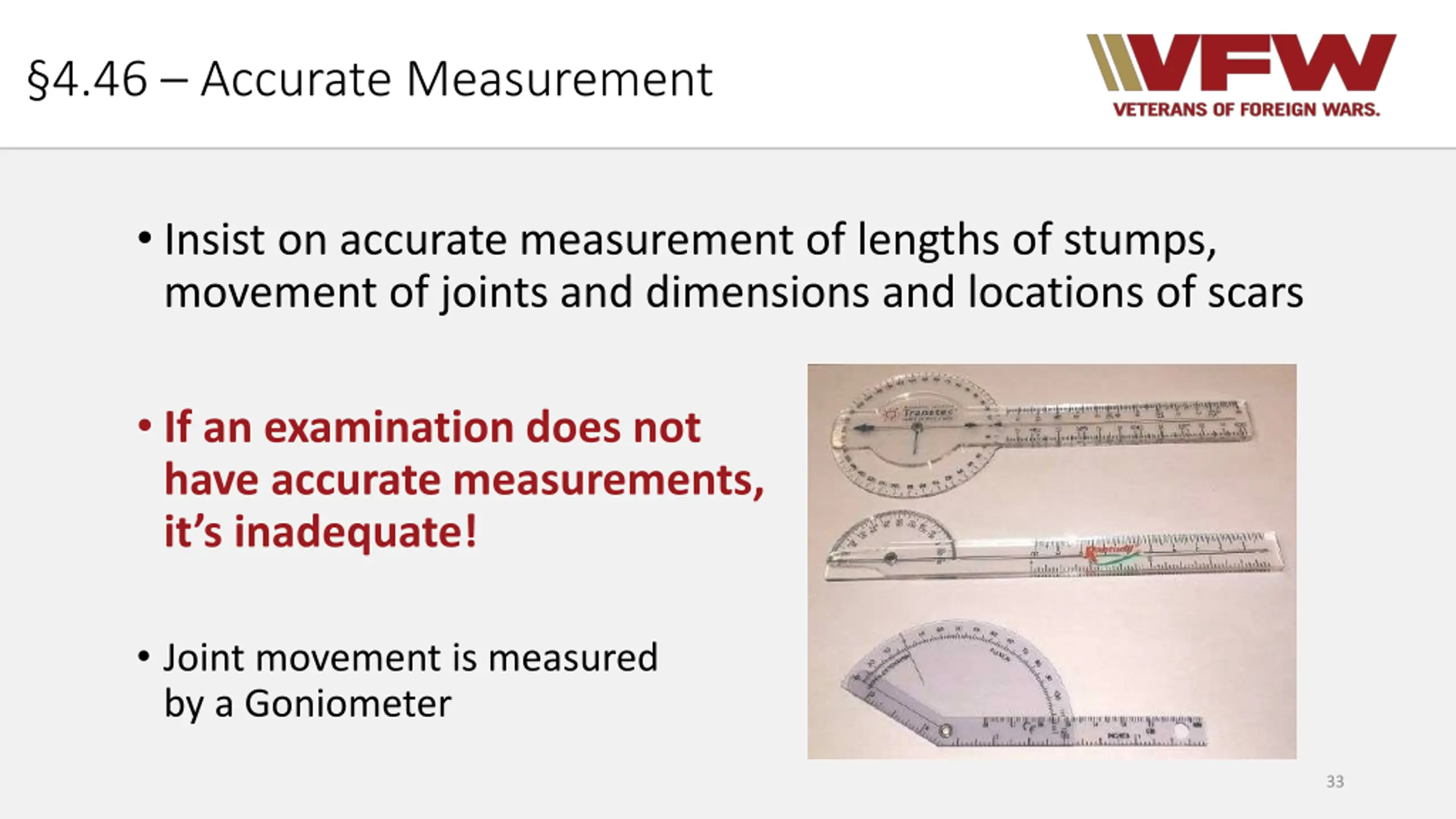 4.46 Accurate Measurement Insist on accurate measurement of lengths of stumps, movement of joints and dimensions and locations of scars If an examination does not have accurate measurements, it s inadequate! Joint movement is measured by a Goniometer 33