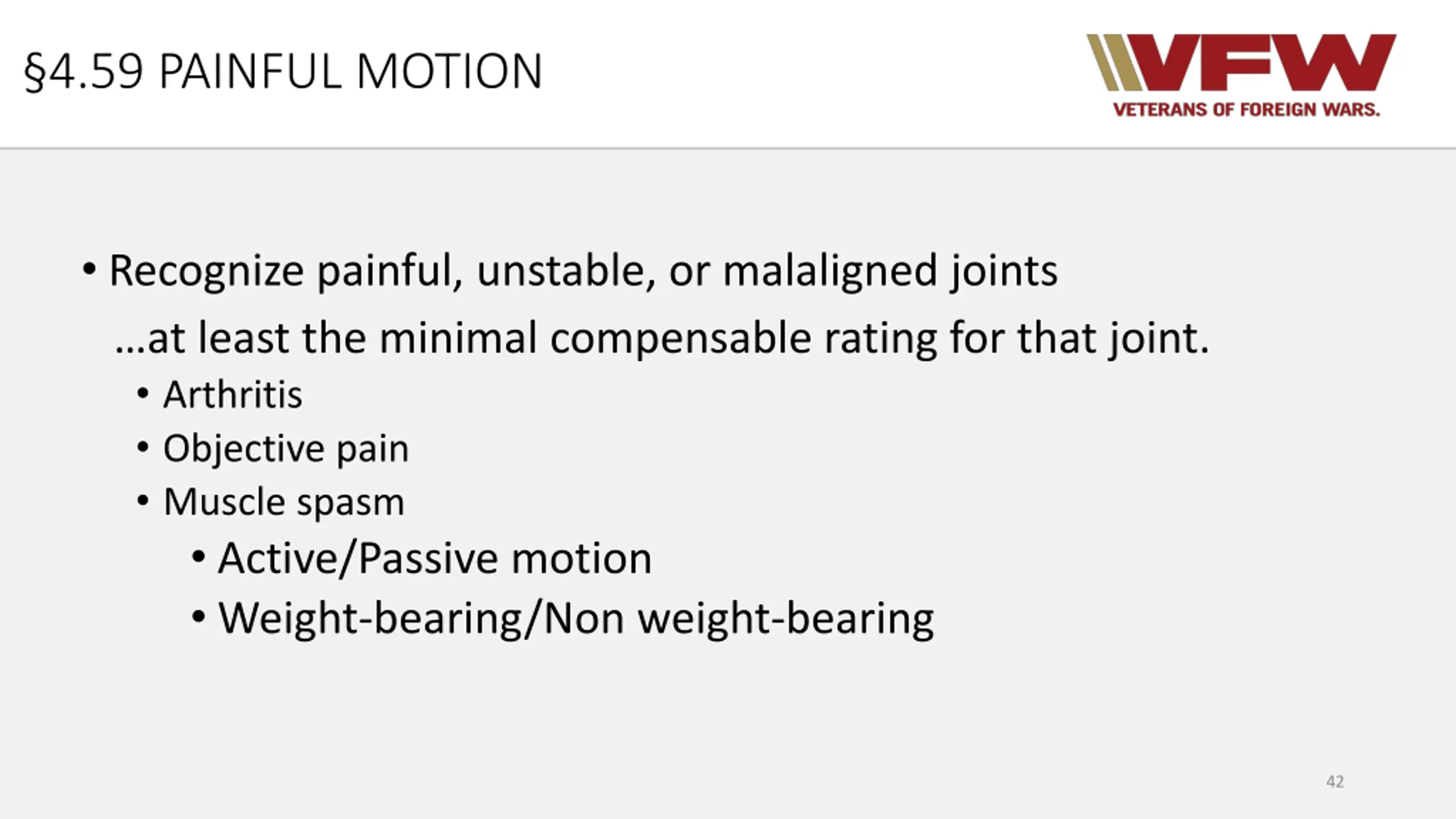 4.59 PAINFUL MOTION Recognize painful, unstable, or malaligned joints at least the minimal compensable rating for that joint. Arthritis Objective pain Muscle spasm Active/Passive motion Weight-bearing/Non weight-bearing 42