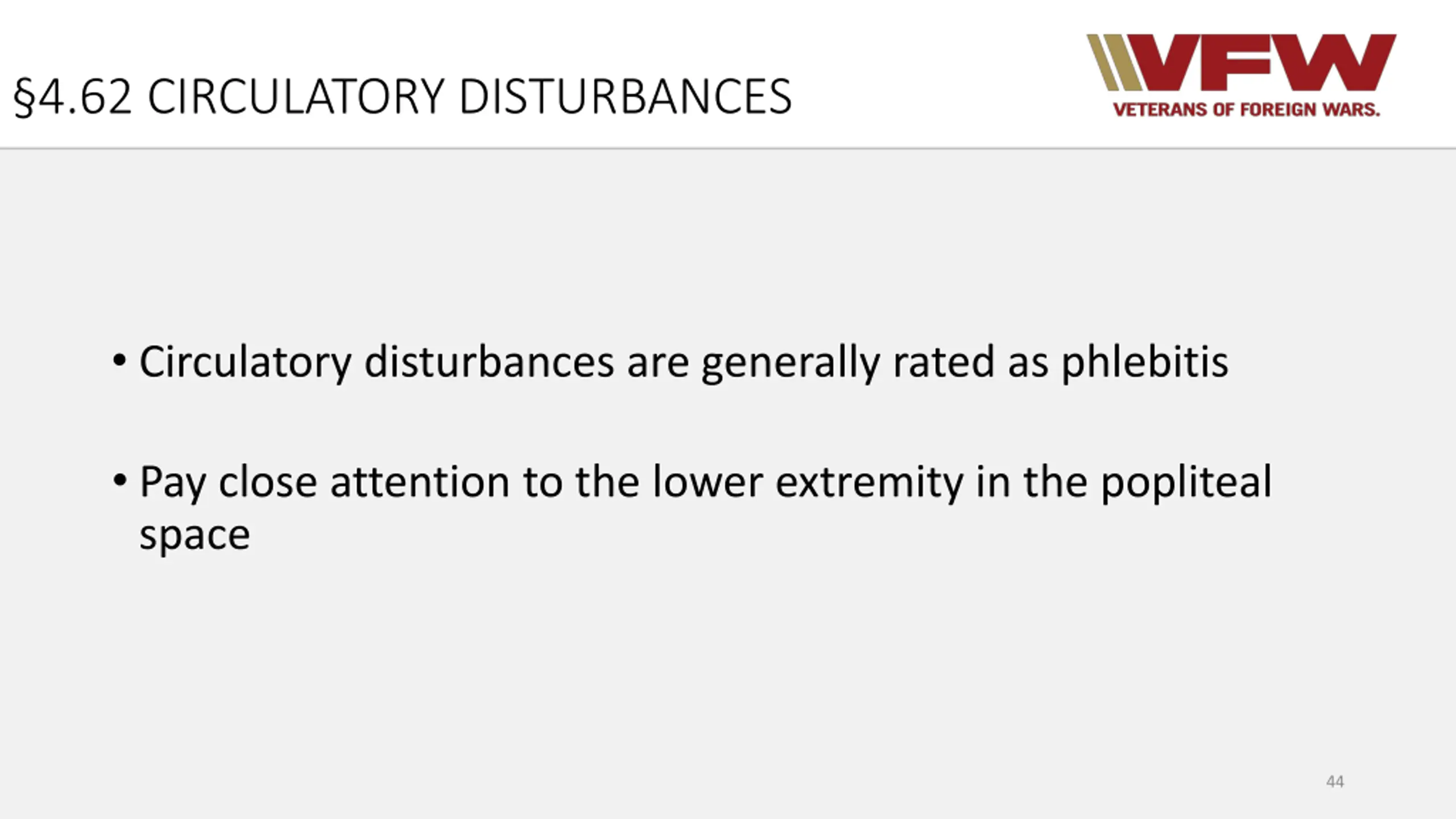 4.62 CIRCULATORY DISTURBANCES Circulatory disturbances are generally rated as phlebitis Pay close attention to the lower extremity in the popliteal space 44