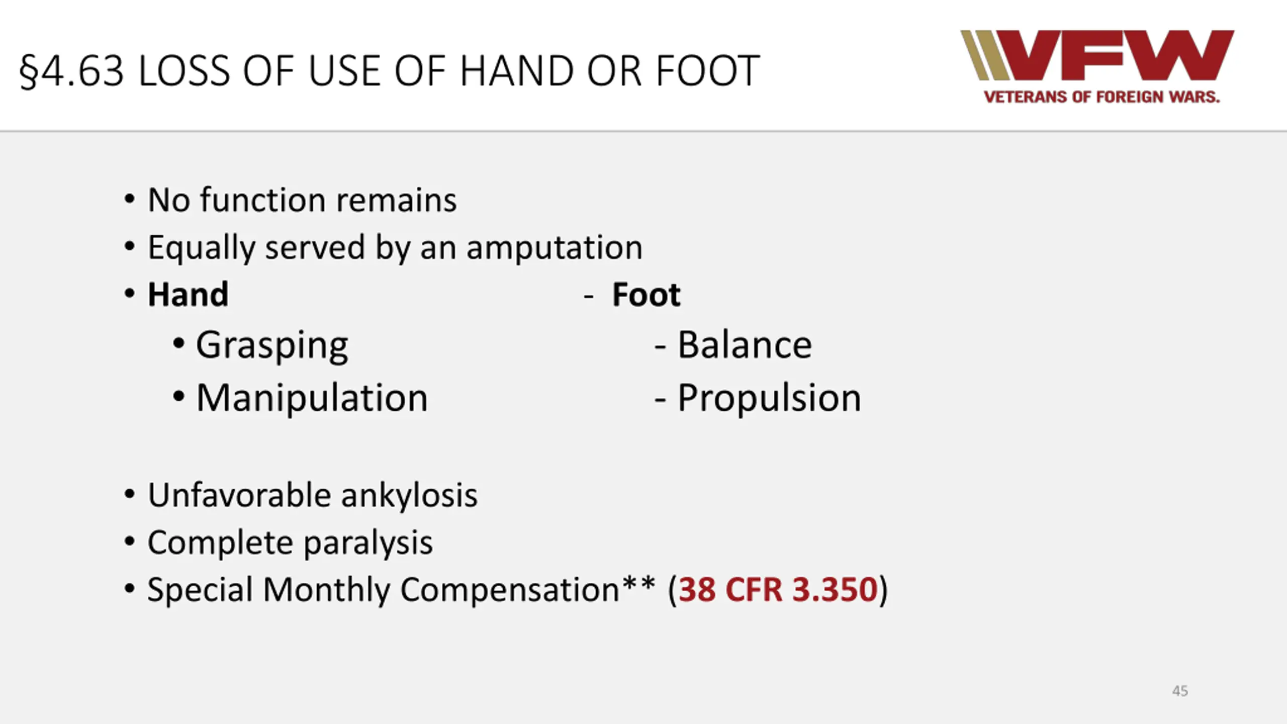 4.63 LOSS OF USE OF HAND OR FOOT No function remains Equally served by an amputation Hand Grasping Manipulation - Foot - Balance - Propulsion Unfavorable ankylosis Complete paralysis Special Monthly Compensation** (38 CFR 3.350) 45