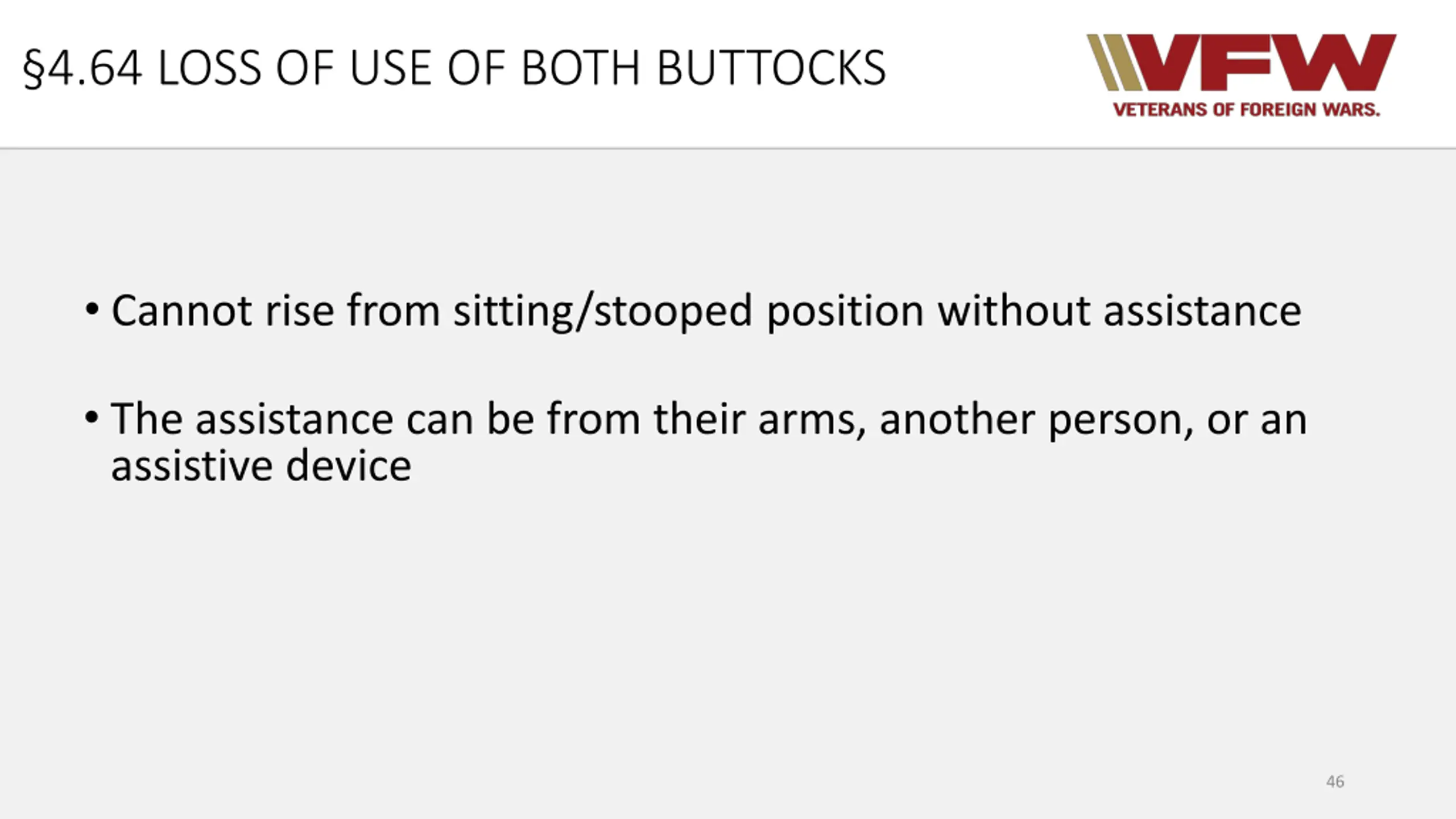 4.64 LOSS OF USE OF BOTH BUTTOCKS Cannot rise from sitting/stooped position without assistance The assistance can be from their arms, another person, or an assistive device 46