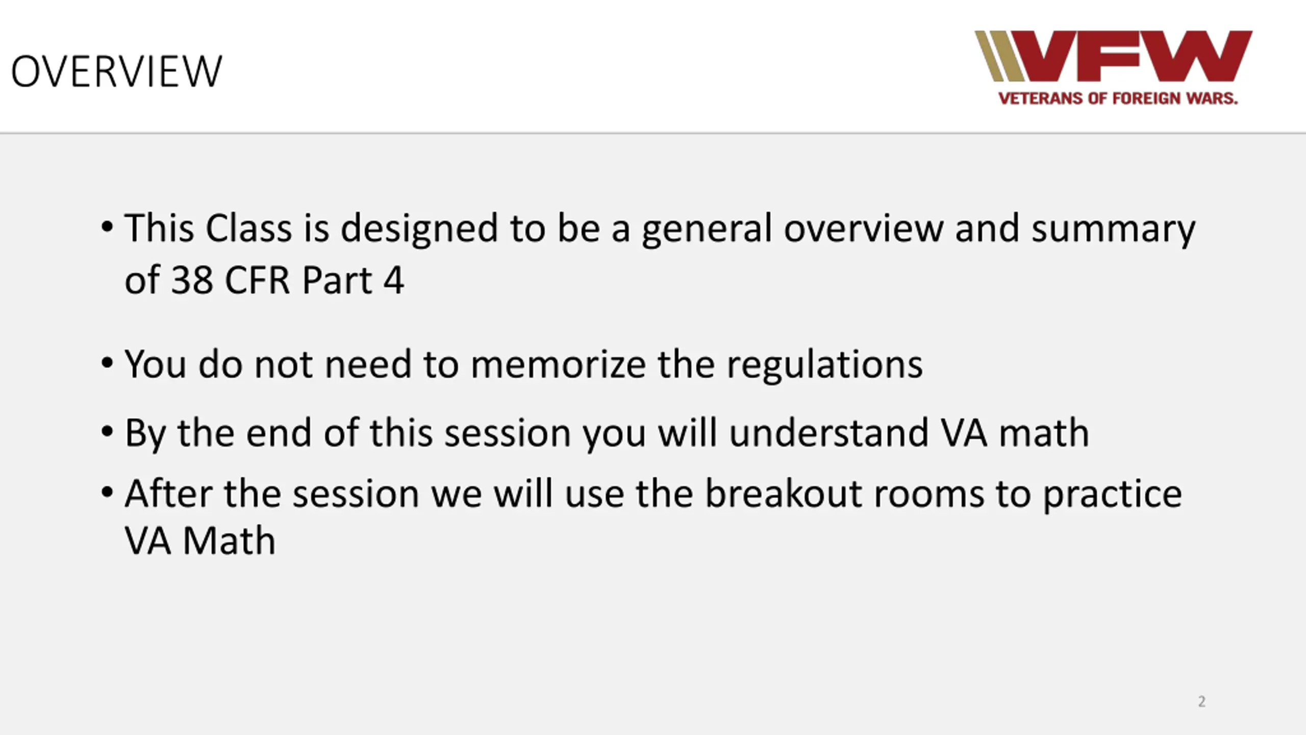 OVERVIEW This Class is designed to be a general overview and summary of 38 CFR Part 4 You do not need to memorize the regulations By the end of this session you will understand VA math After the session we will use the breakout rooms to practice VA Math 2