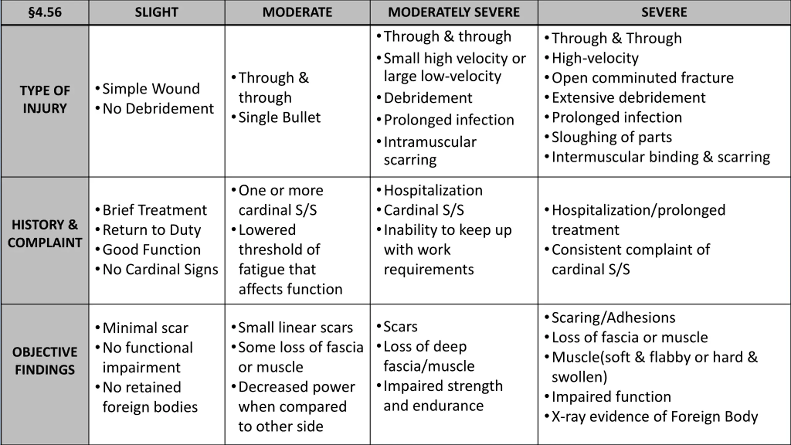 4.56 SLIGHT MODERATE MODERATELY SEVERE Through & through Small high velocity or large low-velocity Debridement Prolonged infection Intramuscular scarring SEVERE Through & Through High-velocity Open comminuted fracture Extensive debridement Prolonged infection Sloughing of parts Intermuscular binding & scarring Through & through Single Bullet Simple Wound No Debridement TYPE OF INJURY One or more cardinal S/S Lowered threshold of fatigue that affects function Hospitalization Cardinal S/S Inability to keep up with work requirements Brief Treatment Return to Duty Good Function No Cardinal Signs Hospitalization/prolonged treatment Consistent complaint of cardinal S/S HISTORY & COMPLAINT Scaring/Adhesions Loss of fascia or muscle Muscle(soft & flabby or hard & swollen) Impaired function X-ray evidence of Foreign Body Scars Loss of deep fascia/muscle Impaired strength and endurance Small linear scars Some loss of fascia or muscle Decreased power when compared to other side Minimal scar No functional impairment No retained foreign bodies OBJECTIVE FINDINGS 39