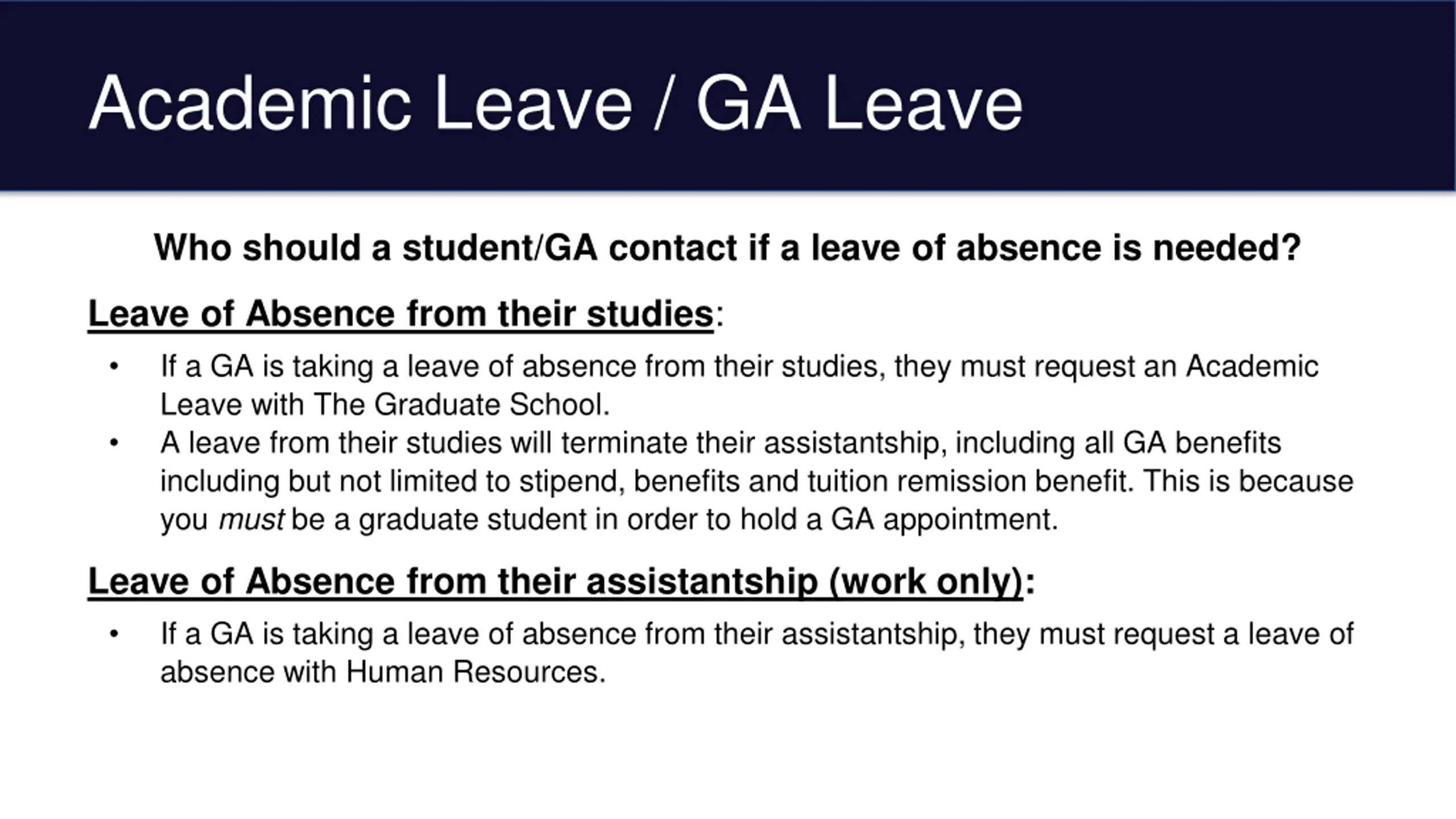 Academic Leave / GA Leave Who should a student/GA contact if a leave of absence is needed? Leave of Absence from their studies: If a GA is taking a leave of absence from their studies, they must request an Academic Leave with The Graduate School. A leave from their studies will terminate their assistantship, including all GA benefits including but not limited to stipend, benefits and tuition remission benefit. This is because you must be a graduate student in order to hold a GA appointment. Leave of Absence from their assistantship (work only): If a GA is taking a leave of absence from their assistantship, they must request a leave of absence with Human Resources.