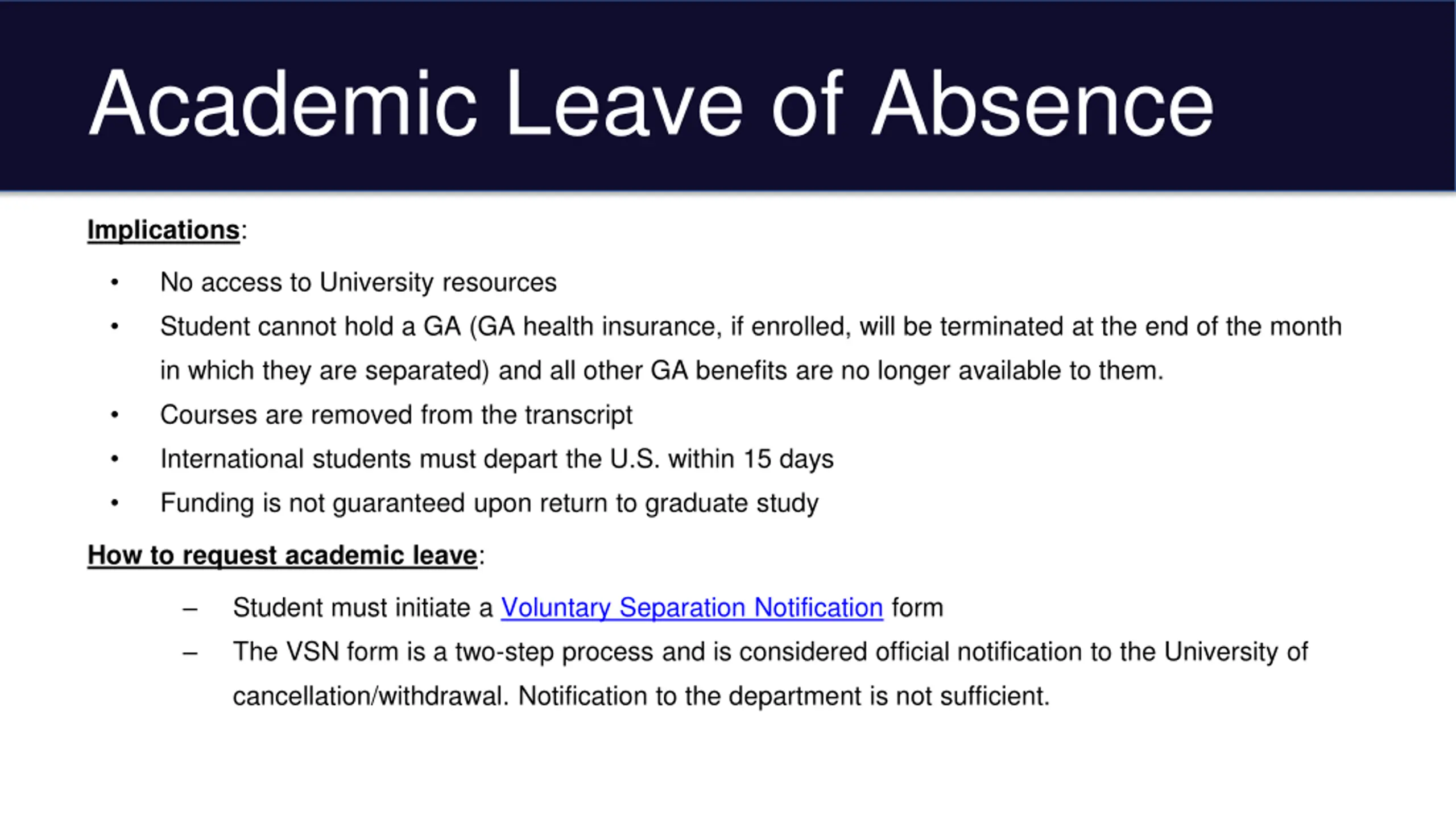 Academic Leave of Absence Implications: No access to University resources Student cannot hold a GA (GA health insurance, if enrolled, will be terminated at the end of the month in which they are separated) and all other GA benefits are no longer available to them. Courses are removed from the transcript International students must depart the U.S. within 15 days Funding is not guaranteed upon return to graduate study How to request academic leave: Student must initiate a Voluntary Separation Notification form The VSN form is a two-step process and is considered official notification to the University of cancellation/withdrawal. Notification to the department is not sufficient.