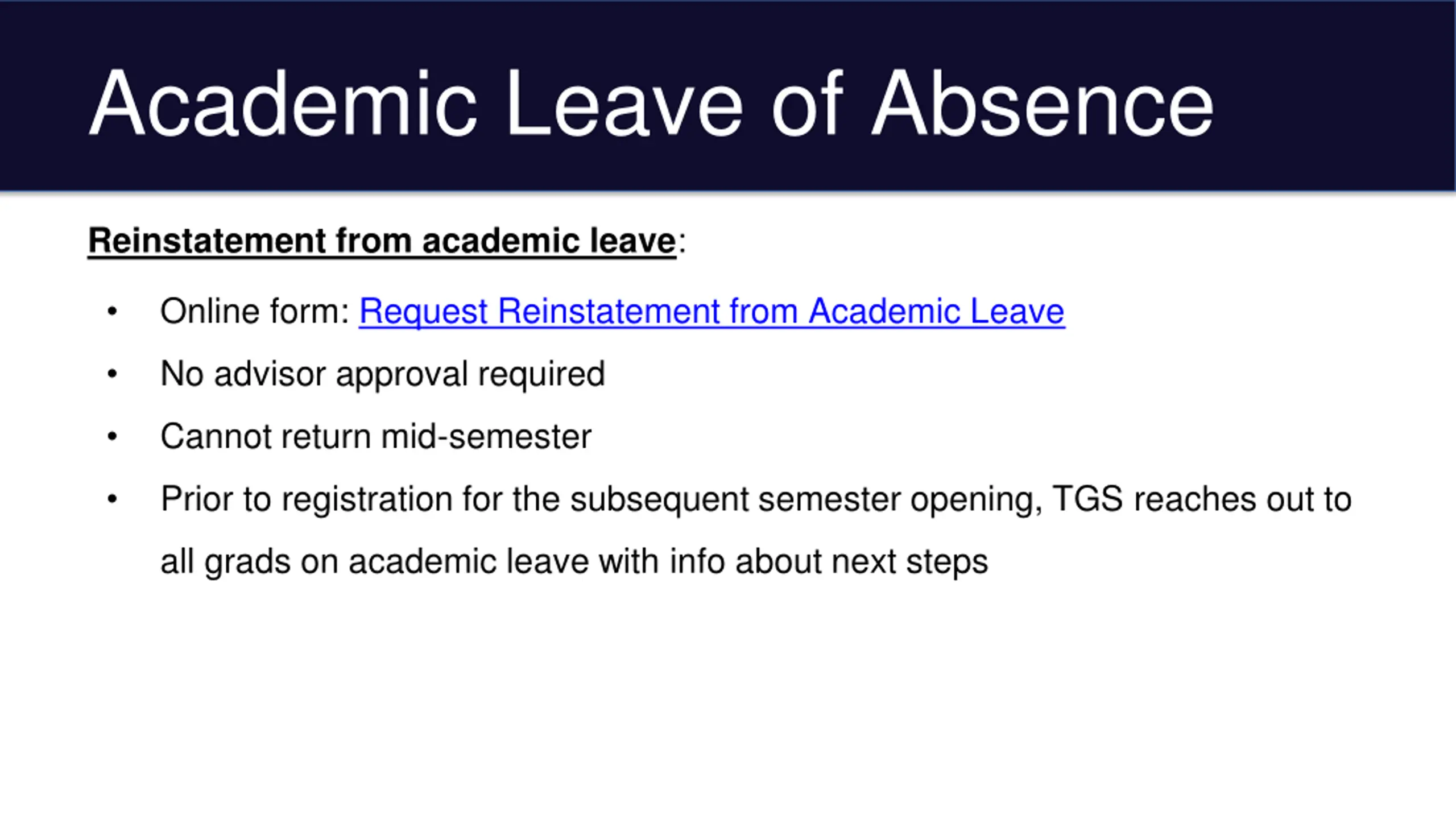 Academic Leave of Absence Reinstatement from academic leave: Online form: Request Reinstatement from Academic Leave No advisor approval required Cannot return mid-semester Prior to registration for the subsequent semester opening, TGS reaches out to all grads on academic leave with info about next steps
