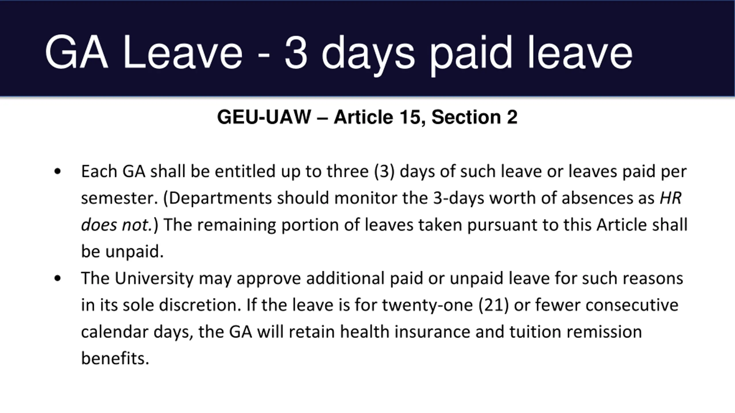 GA Leave - 3 days paid leave GEU-UAW Article 15, Section 2 Each GA shall be entitled up to three (3) days of such leave or leaves paid per semester. (Departments should monitor the 3-days worth of absences as HR does not.) The remaining portion of leaves taken pursuant to this Article shall be unpaid. The University may approve additional paid or unpaid leave for such reasons in its sole discretion. If the leave is for twenty-one (21) or fewer consecutive calendar days, the GA will retain health insurance and tuition remission benefits.
