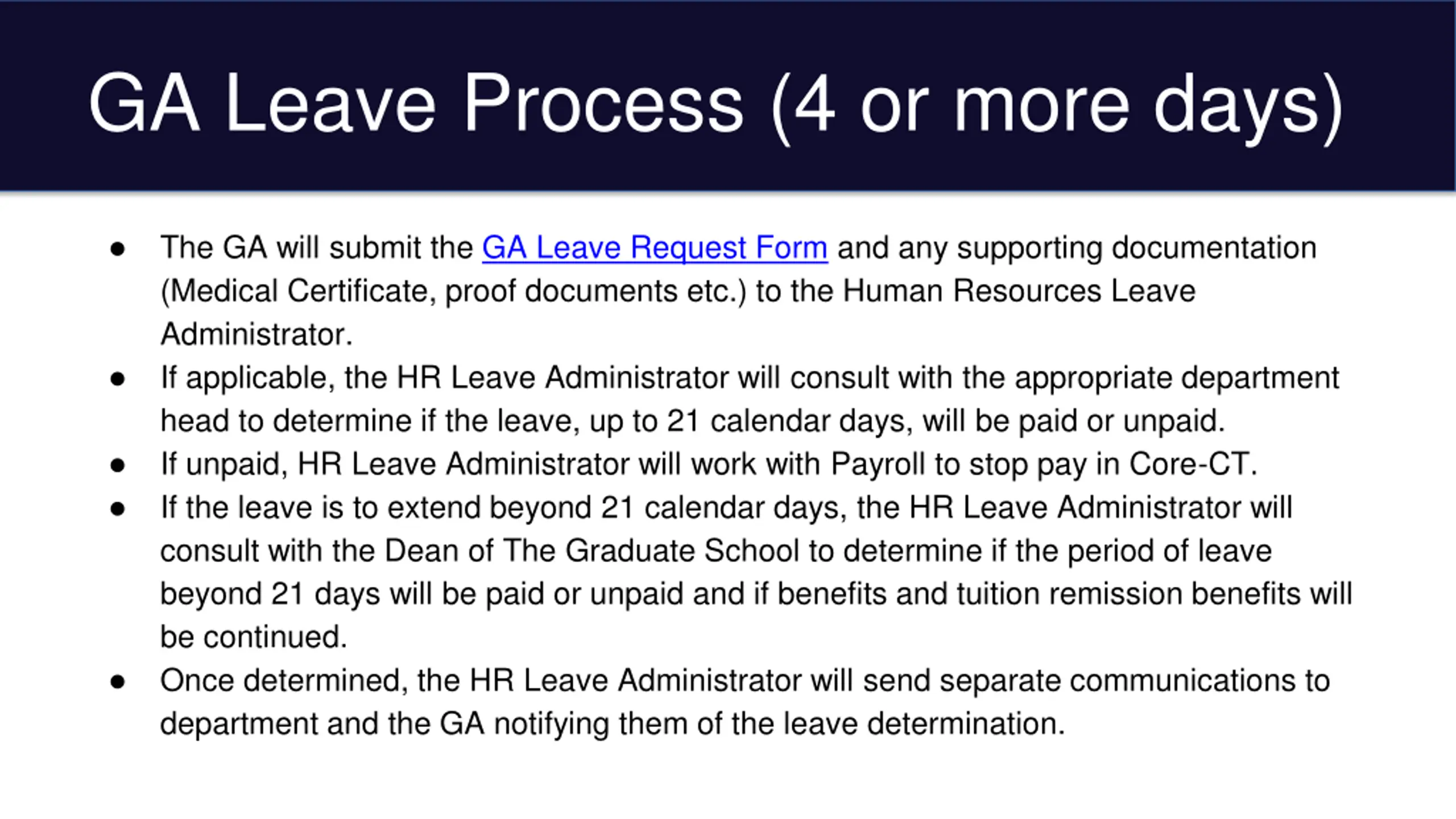 GA Leave Process (4 or more days) The GA will submit the GA Leave Request Form and any supporting documentation (Medical Certificate, proof documents etc.) to the Human Resources Leave Administrator. If applicable, the HR Leave Administrator will consult with the appropriate department head to determine if the leave, up to 21 calendar days, will be paid or unpaid. If unpaid, HR Leave Administrator will work with Payroll to stop pay in Core-CT. If the leave is to extend beyond 21 calendar days, the HR Leave Administrator will consult with the Dean of The Graduate School to determine if the period of leave beyond 21 days will be paid or unpaid and if benefits and tuition remission benefits will be continued. Once determined, the HR Leave Administrator will send separate communications to department and the GA notifying them of the leave determination.