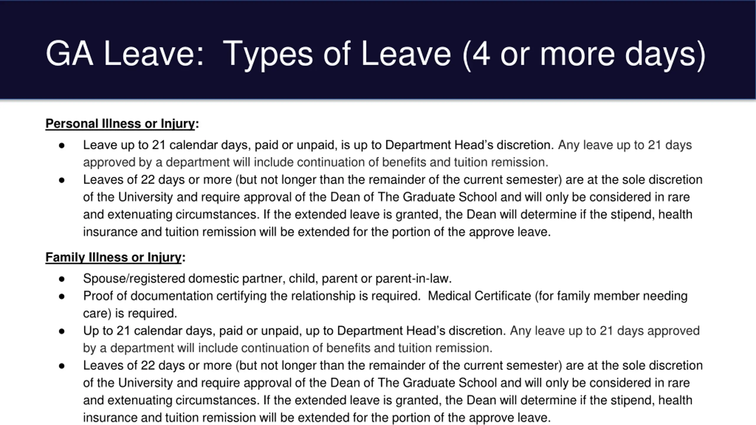 GA Leave: Types of Leave (4 or more days) Personal Illness or Injury: Leave up to 21 calendar days, paid or unpaid, is up to Department Head s discretion. Any leave up to 21 days approved by a department will include continuation of benefits and tuition remission. Leaves of 22 days or more (but not longer than the remainder of the current semester) are at the sole discretion of the University and require approval of the Dean of The Graduate School and will only be considered in rare and extenuating circumstances. If the extended leave is granted, the Dean will determine if the stipend, health insurance and tuition remission will be extended for the portion of the approve leave. Family Illness or Injury: Spouse/registered domestic partner, child, parent or parent-in-law. Proof of documentation certifying the relationship is required. Medical Certificate (for family member needing care) is required. Up to 21 calendar days, paid or unpaid, up to Department Head s discretion. Any leave up to 21 days approved by a department will include continuation of benefits and tuition remission. Leaves of 22 days or more (but not longer than the remainder of the current semester) are at the sole discretion of the University and require approval of the Dean of The Graduate School and will only be considered in rare and extenuating circumstances. If the extended leave is granted, the Dean will determine if the stipend, health insurance and tuition remission will be extended for the portion of the approve leave.