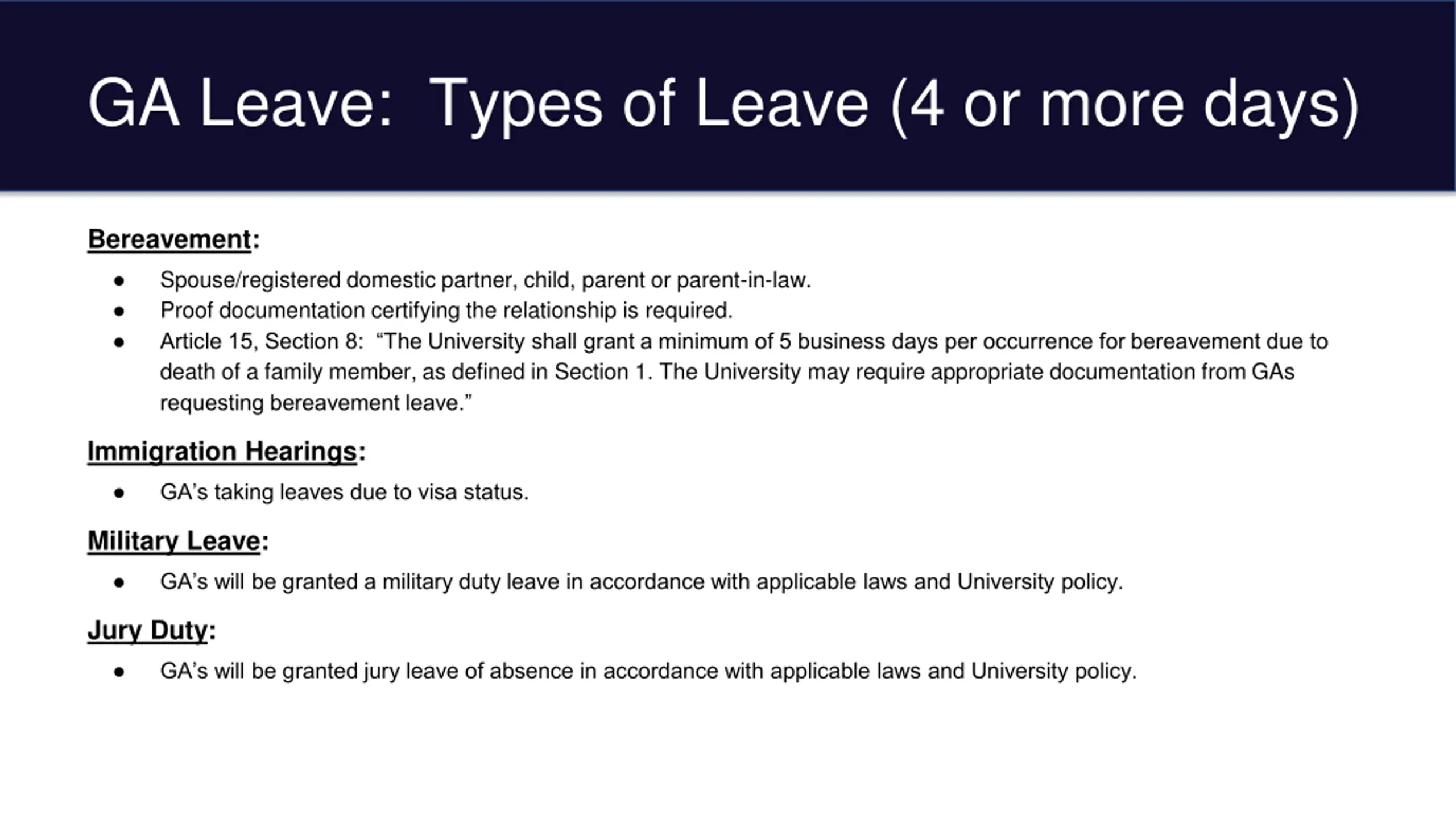 GA Leave: Types of Leave (4 or more days) Bereavement: Spouse/registered domestic partner, child, parent or parent-in-law. Proof documentation certifying the relationship is required. Article 15, Section 8: The University shall grant a minimum of 5 business days per occurrence for bereavement due to death of a family member, as defined in Section 1. The University may require appropriate documentation from GAs requesting bereavement leave. Immigration Hearings: GA s taking leaves due to visa status. Military Leave: GA s will be granted a military duty leave in accordance with applicable laws and University policy. Jury Duty: GA s will be granted jury leave of absence in accordance with applicable laws and University policy.