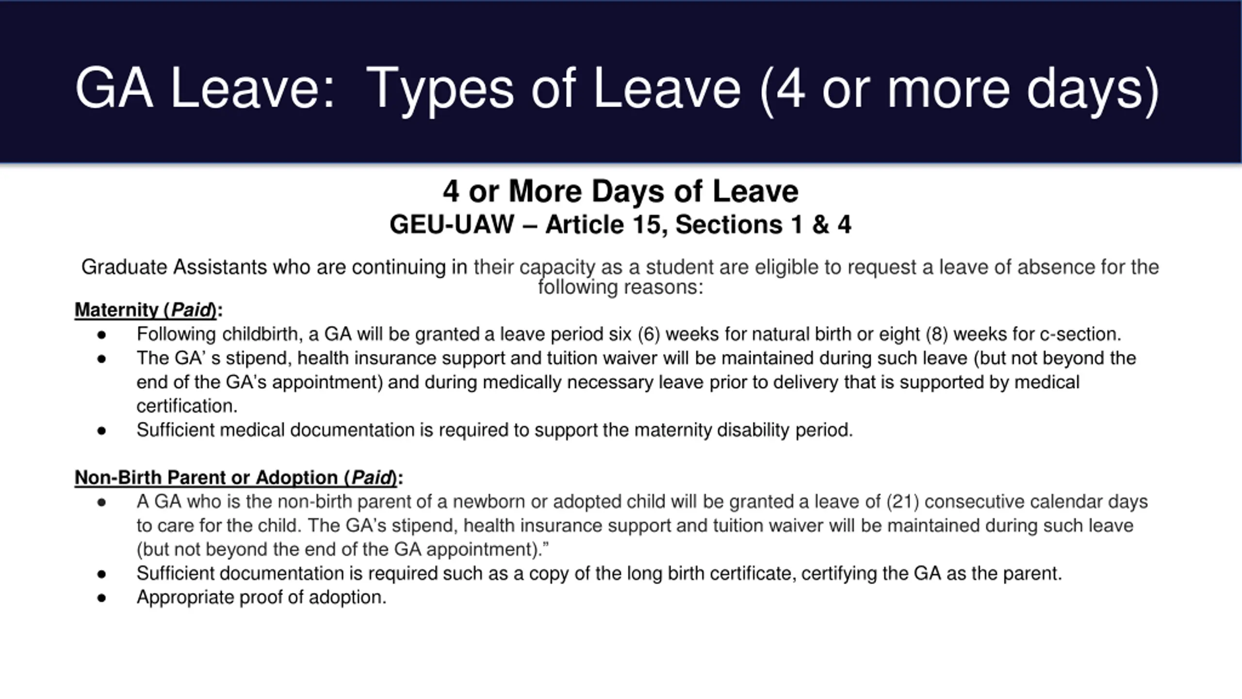 GA Leave: Types of Leave (4 or more days) 4 or More Days of Leave GEU-UAW Article 15, Sections 1 & 4 Graduate Assistants who are continuing in their capacity as a student are eligible to request a leave of absence for the following reasons: Maternity (Paid): Following childbirth, a GA will be granted a leave period six (6) weeks for natural birth or eight (8) weeks for c-section. The GA s stipend, health insurance support and tuition waiver will be maintained during such leave (but not beyond the end of the GA s appointment) and during medically necessary leave prior to delivery that is supported by medical certification. Sufficient medical documentation is required to support the maternity disability period. Non-Birth Parent or Adoption (Paid): A GA who is the non-birth parent of a newborn or adopted child will be granted a leave of (21) consecutive calendar days to care for the child. The GA s stipend, health insurance support and tuition waiver will be maintained during such leave (but not beyond the end of the GA appointment). Sufficient documentation is required such as a copy of the long birth certificate, certifying the GA as the parent. Appropriate proof of adoption.