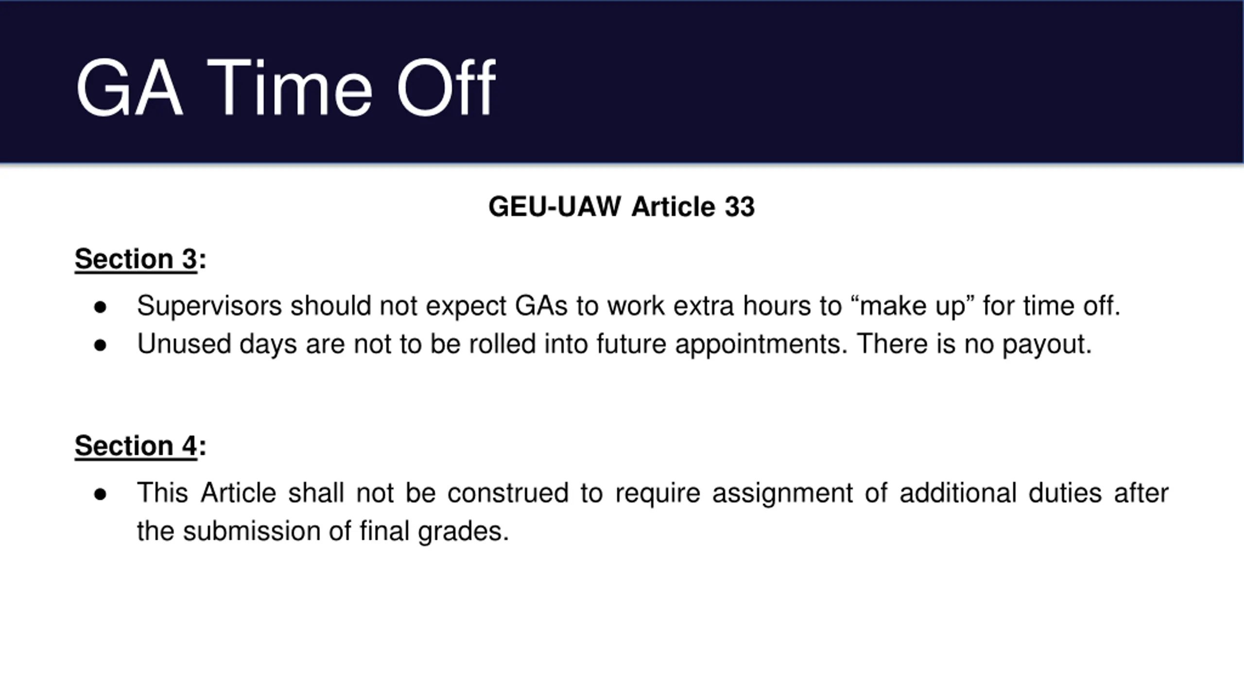 GA Time Off GEU-UAW Article 33 Section 3: Supervisors should not expect GAs to work extra hours to make up for time off. Unused days are not to be rolled into future appointments. There is no payout. Section 4: This Article shall not be construed to require assignment of additional duties after the submission of final grades.