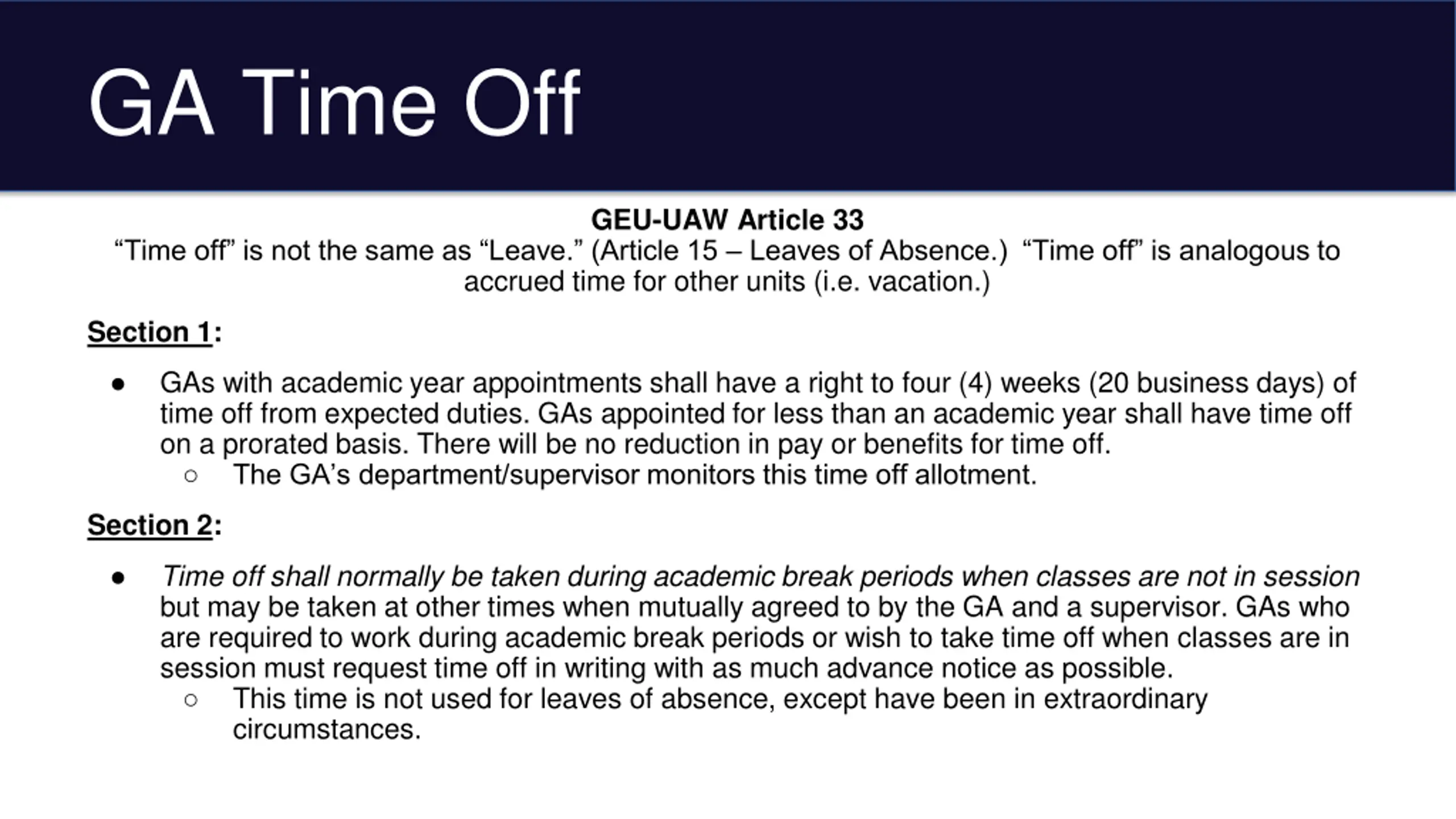GA Time Off GEU-UAW Article 33 Time off is not the same as Leave. (Article 15 Leaves of Absence.) Time off is analogous to accrued time for other units (i.e. vacation.) Section 1: GAs with academic year appointments shall have a right to four (4) weeks (20 business days) of time off from expected duties. GAs appointed for less than an academic year shall have time off on a prorated basis. There will be no reduction in pay or benefits for time off. The GA s department/supervisor monitors this time off allotment. Section 2: Time off shall normally be taken during academic break periods when classes are not in session but may be taken at other times when mutually agreed to by the GA and a supervisor. GAs who are required to work during academic break periods or wish to take time off when classes are in session must request time off in writing with as much advance notice as possible. This time is not used for leaves of absence, except have been in extraordinary circumstances.