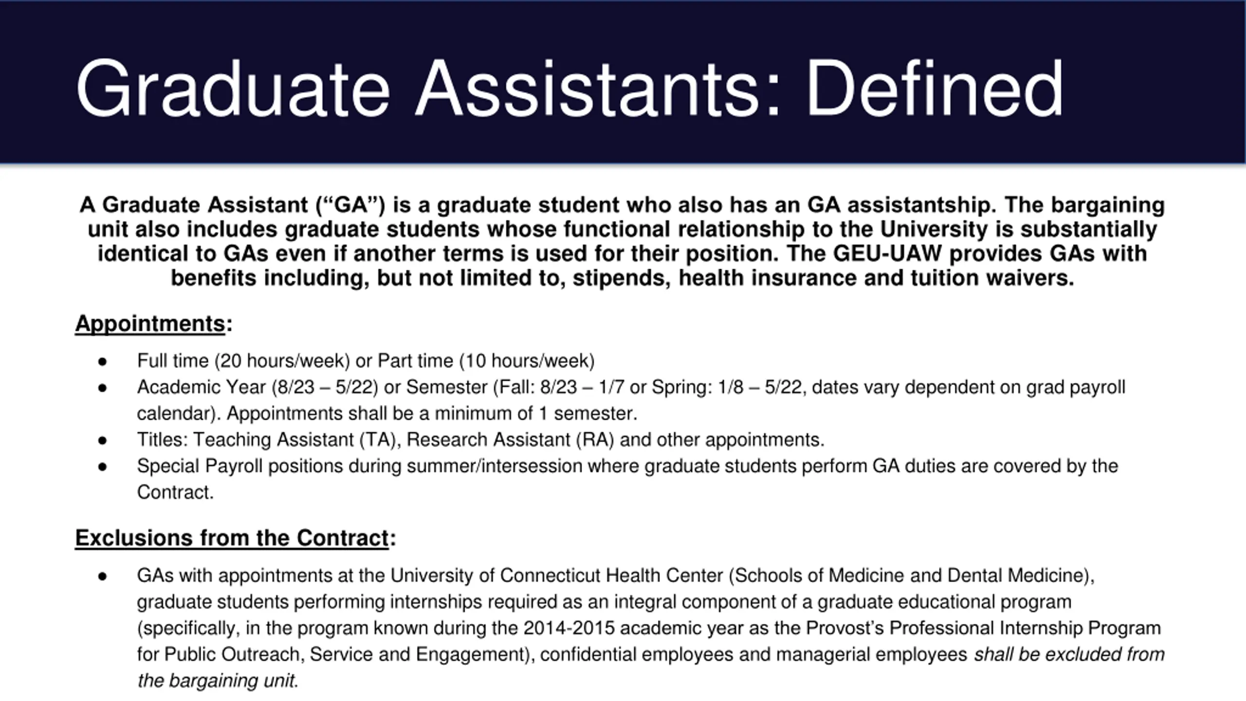 Graduate Assistants: Defined A Graduate Assistant ( GA ) is a graduate student who also has an GA assistantship. The bargaining unit also includes graduate students whose functional relationship to the University is substantially identical to GAs even if another terms is used for their position. The GEU-UAW provides GAs with benefits including, but not limited to, stipends, health insurance and tuition waivers. Appointments: Full time (20 hours/week) or Part time (10 hours/week) Academic Year (8/23 5/22) or Semester (Fall: 8/23 1/7 or Spring: 1/8 5/22, dates vary dependent on grad payroll calendar). Appointments shall be a minimum of 1 semester. Titles: Teaching Assistant (TA), Research Assistant (RA) and other appointments. Special Payroll positions during summer/intersession where graduate students perform GA duties are covered by the Contract. Exclusions from the Contract: GAs with appointments at the University of Connecticut Health Center (Schools of Medicine and Dental Medicine), graduate students performing internships required as an integral component of a graduate educational program (specifically, in the program known during the 2014-2015 academic year as the Provost s Professional Internship Program for Public Outreach, Service and Engagement), confidential employees and managerial employees shall be excluded from the bargaining unit.