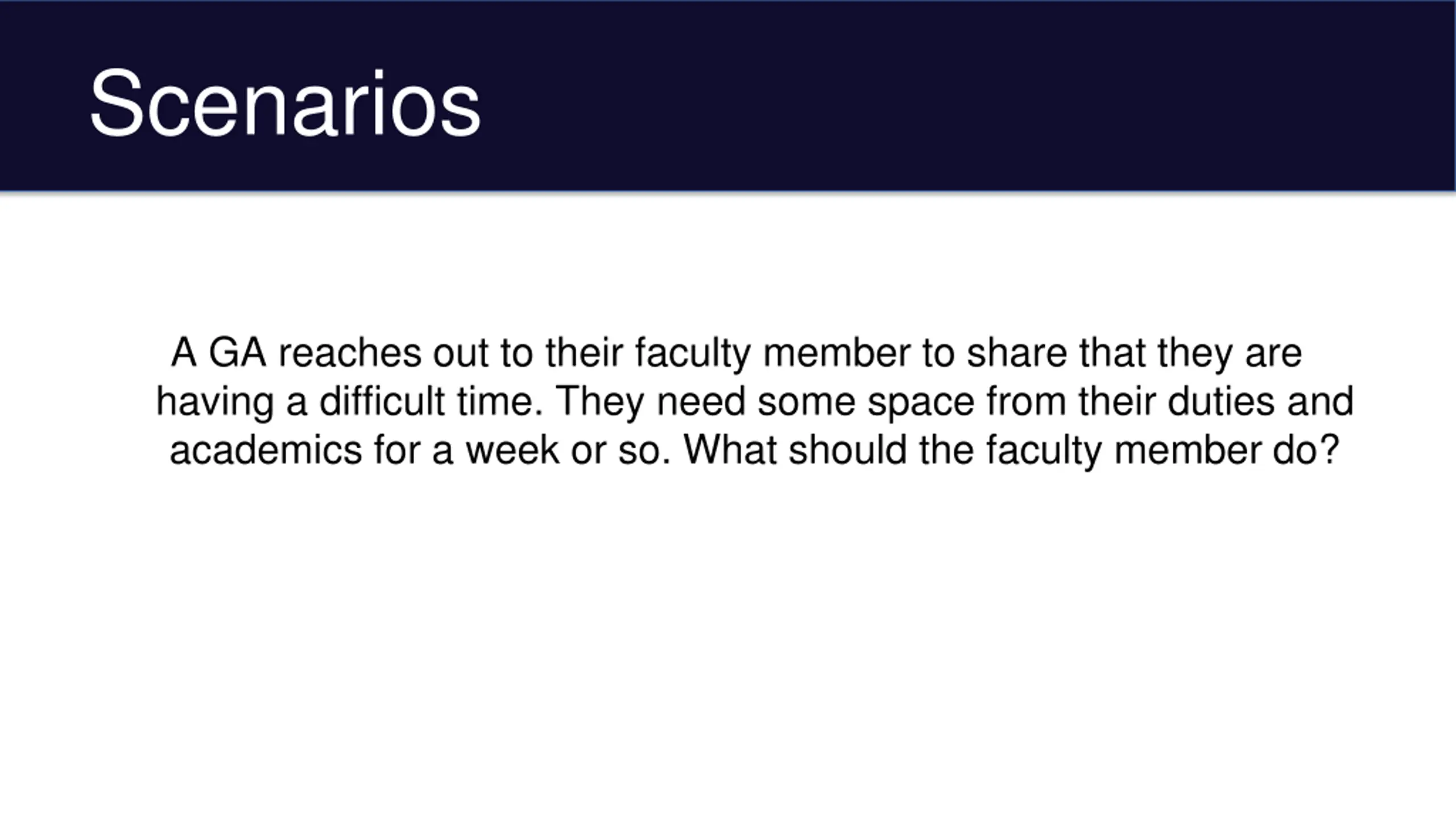 Scenarios A GA reaches out to their faculty member to share that they are having a difficult time. They need some space from their duties and academics for a week or so. What should the faculty member do?