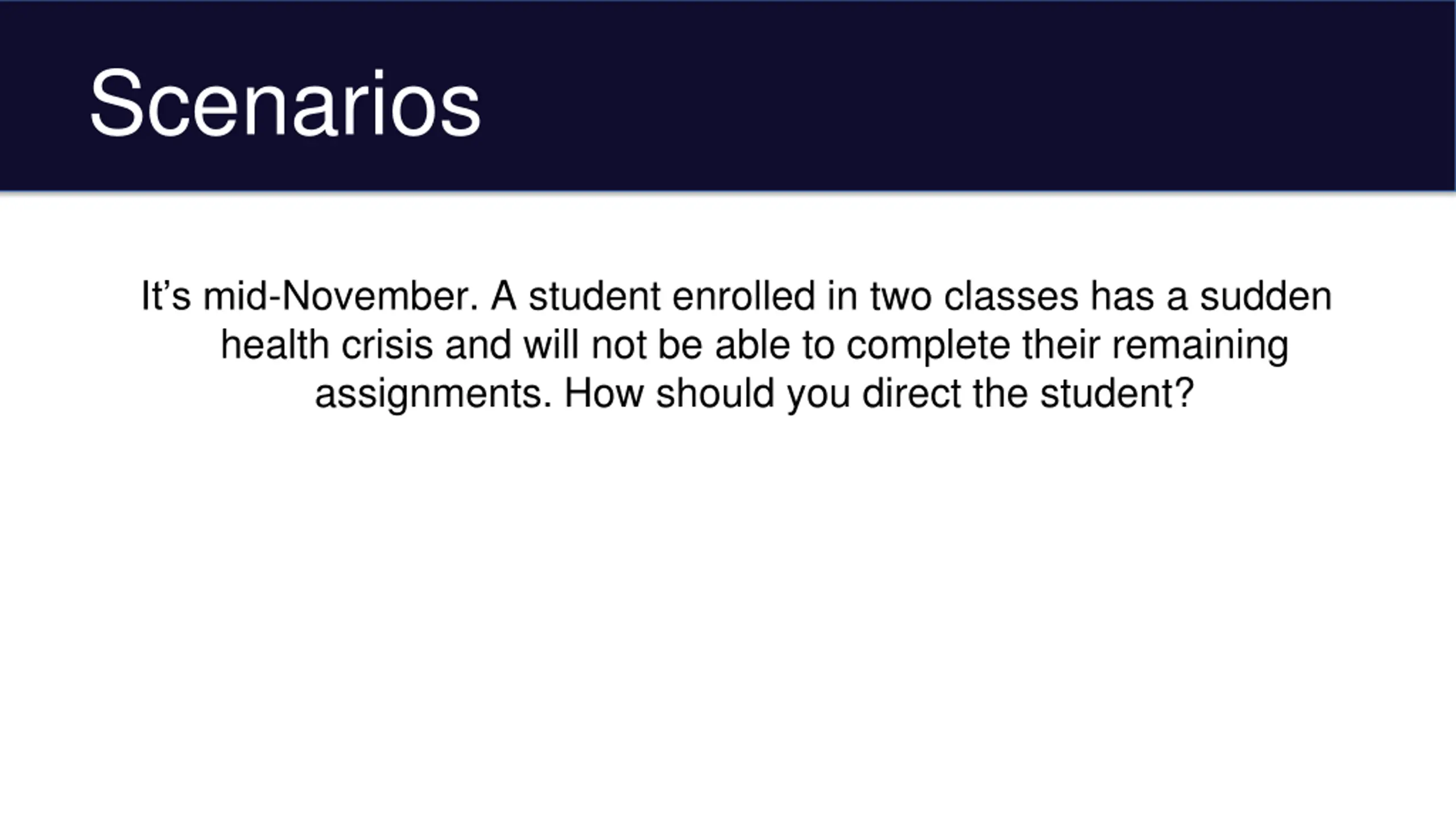Scenarios It s mid-November. A student enrolled in two classes has a sudden health crisis and will not be able to complete their remaining assignments. How should you direct the student?