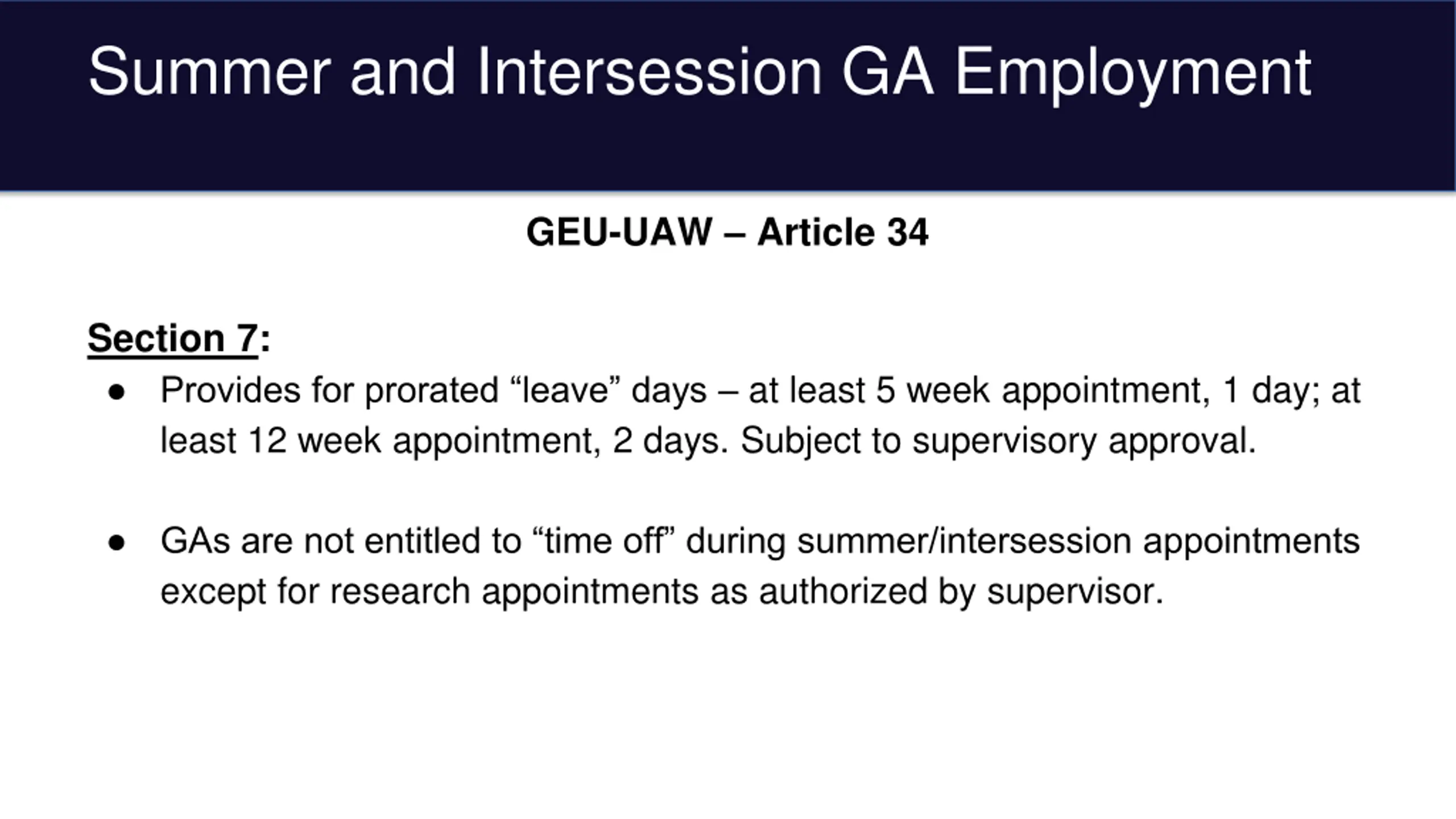 Summer and Intersession GA Employment GEU-UAW Article 34 Section 7: Provides for prorated leave days at least 5 week appointment, 1 day; at least 12 week appointment, 2 days. Subject to supervisory approval. GAs are not entitled to time off during summer/intersession appointments except for research appointments as authorized by supervisor.