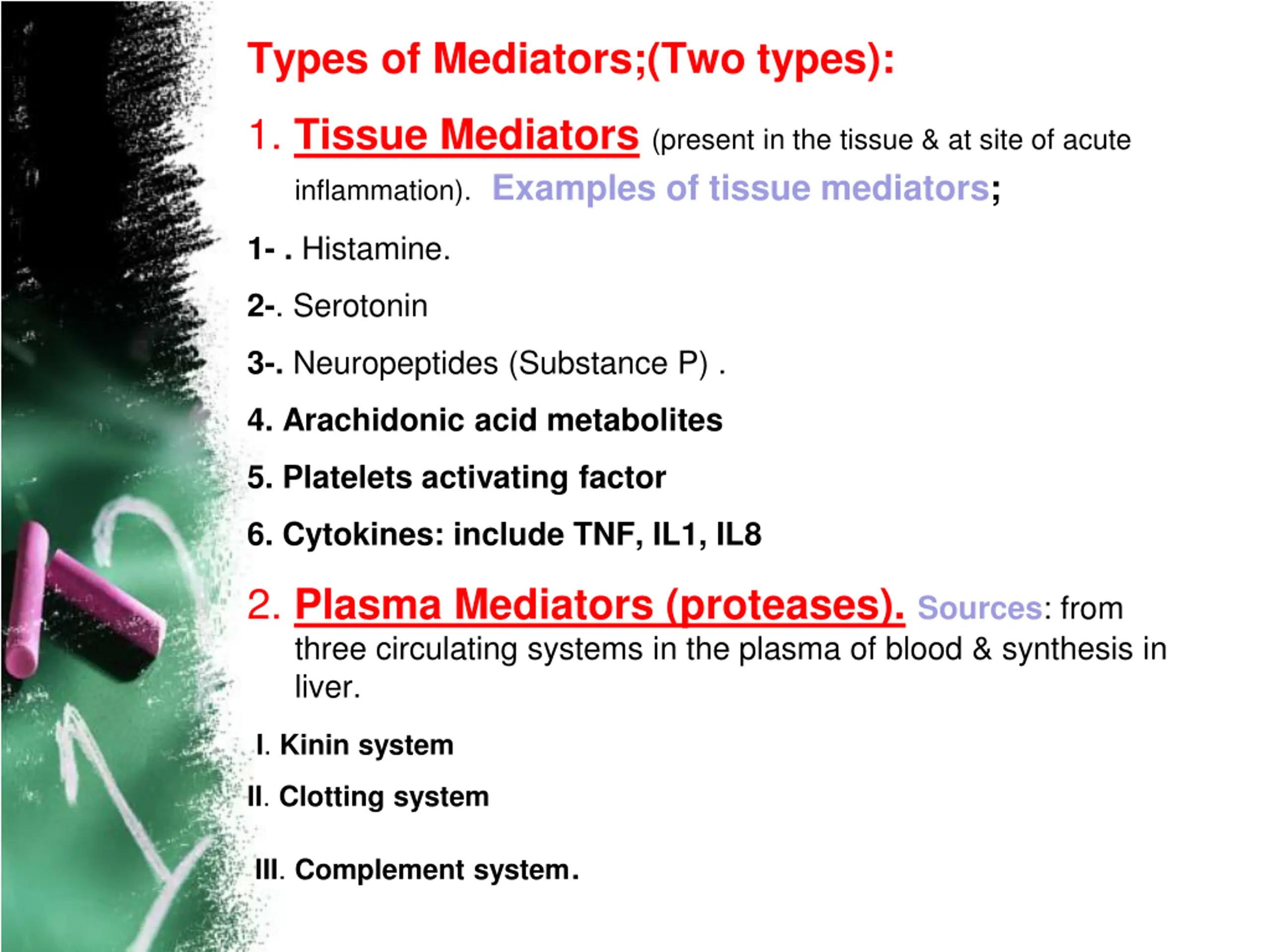 Types of Mediators;(Two types): 1. Tissue Mediators (present in the tissue & at site of acute inflammation). Examples of tissue mediators; 1- . Histamine. 2-. Serotonin 3-. Neuropeptides (Substance P) . 4. Arachidonic acid metabolites 5. Platelets activating factor 6. Cytokines: include TNF, IL1, IL8 2. Plasma Mediators (proteases). Sources: from three circulating systems in the plasma of blood & synthesis in liver. I. Kinin system II. Clotting system III. Complement system.