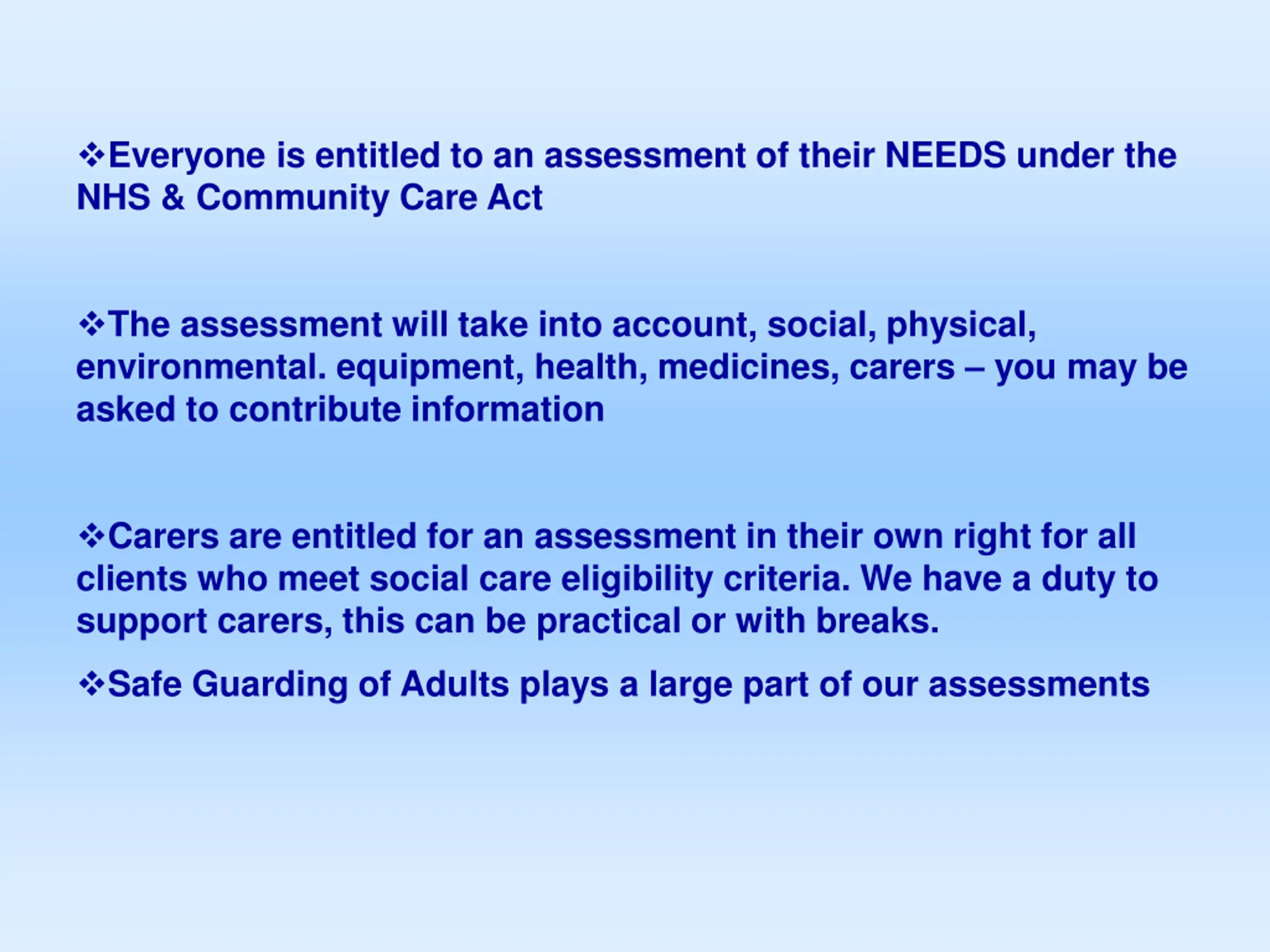 Everyone is entitled to an assessment of their NEEDS under the NHS & Community Care Act The assessment will take into account, social, physical, environmental. equipment, health, medicines, carers you may be asked to contribute information Carers are entitled for an assessment in their own right for all clients who meet social care eligibility criteria. We have a duty to support carers, this can be practical or with breaks. Safe Guarding of Adults plays a large part of our assessments