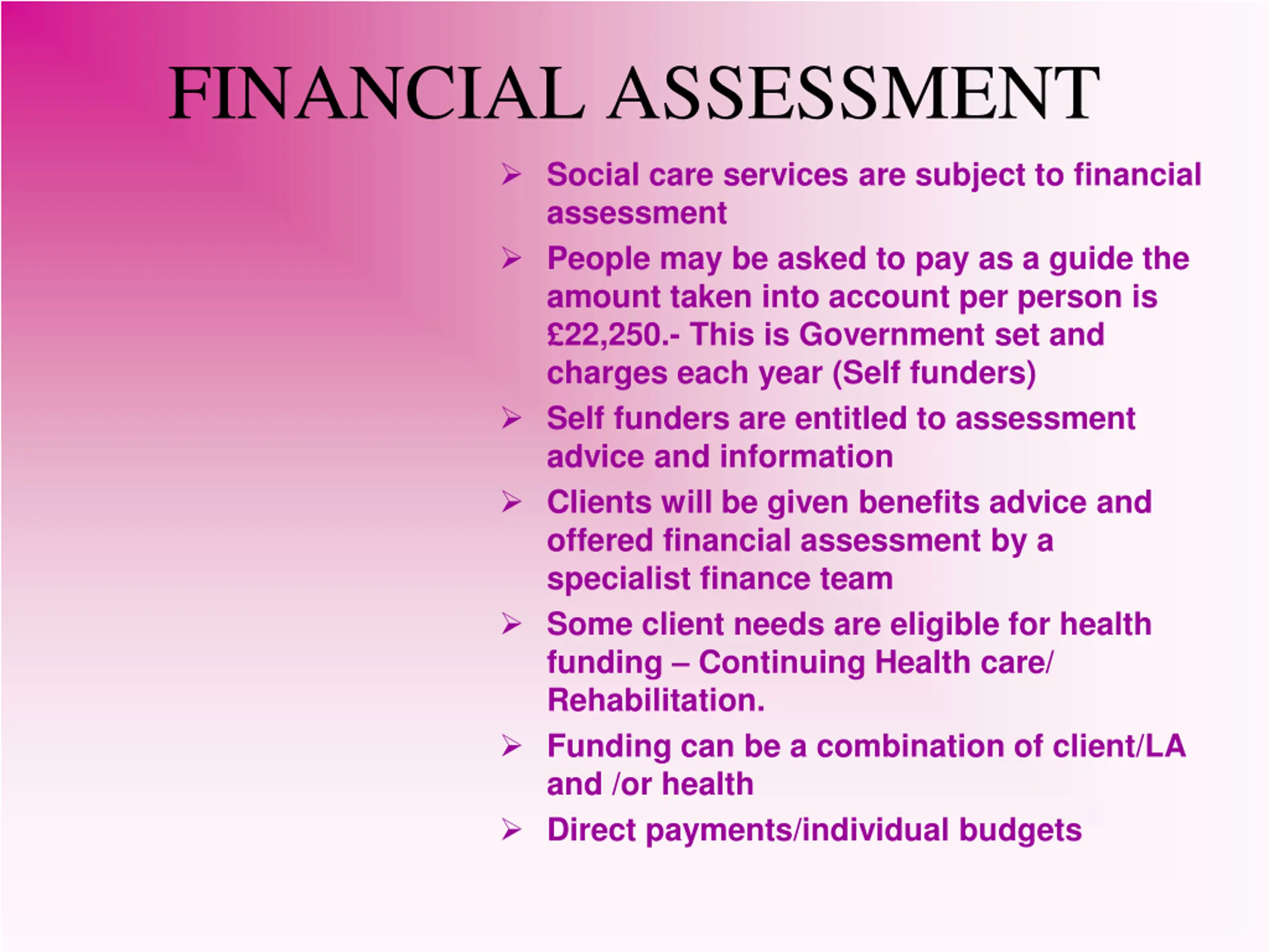 FINANCIAL ASSESSMENT Social care services are subject to financial assessment People may be asked to pay as a guide the amount taken into account per person is 22,250.- This is Government set and charges each year (Self funders) Self funders are entitled to assessment advice and information Clients will be given benefits advice and offered financial assessment by a specialist finance team Some client needs are eligible for health funding Continuing Health care/ Rehabilitation. Funding can be a combination of client/LA and /or health Direct payments/individual budgets