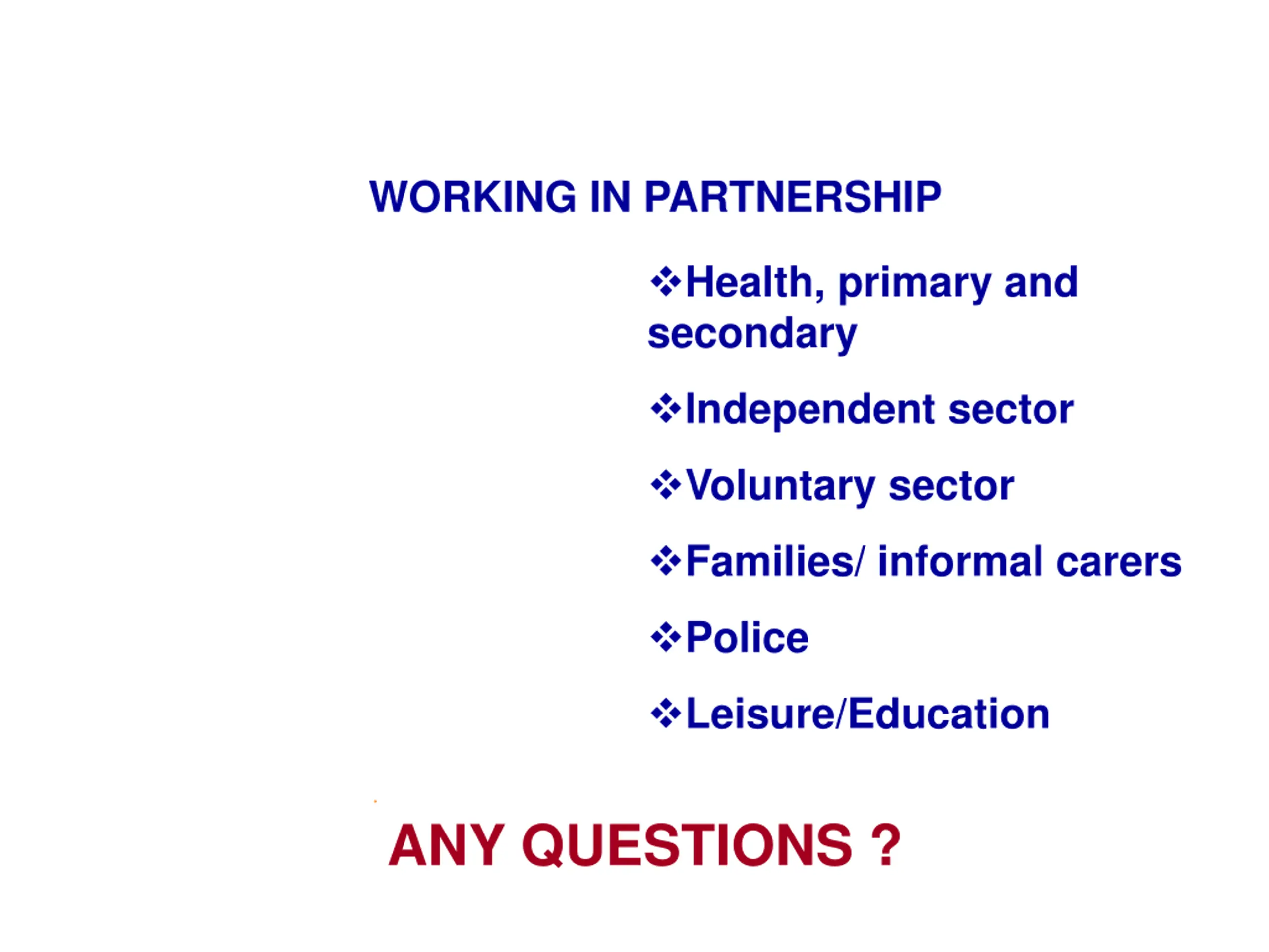 WORKING IN PARTNERSHIP Health, primary and secondary Independent sector Voluntary sector Families/ informal carers Police Leisure/Education . ANY QUESTIONS ?