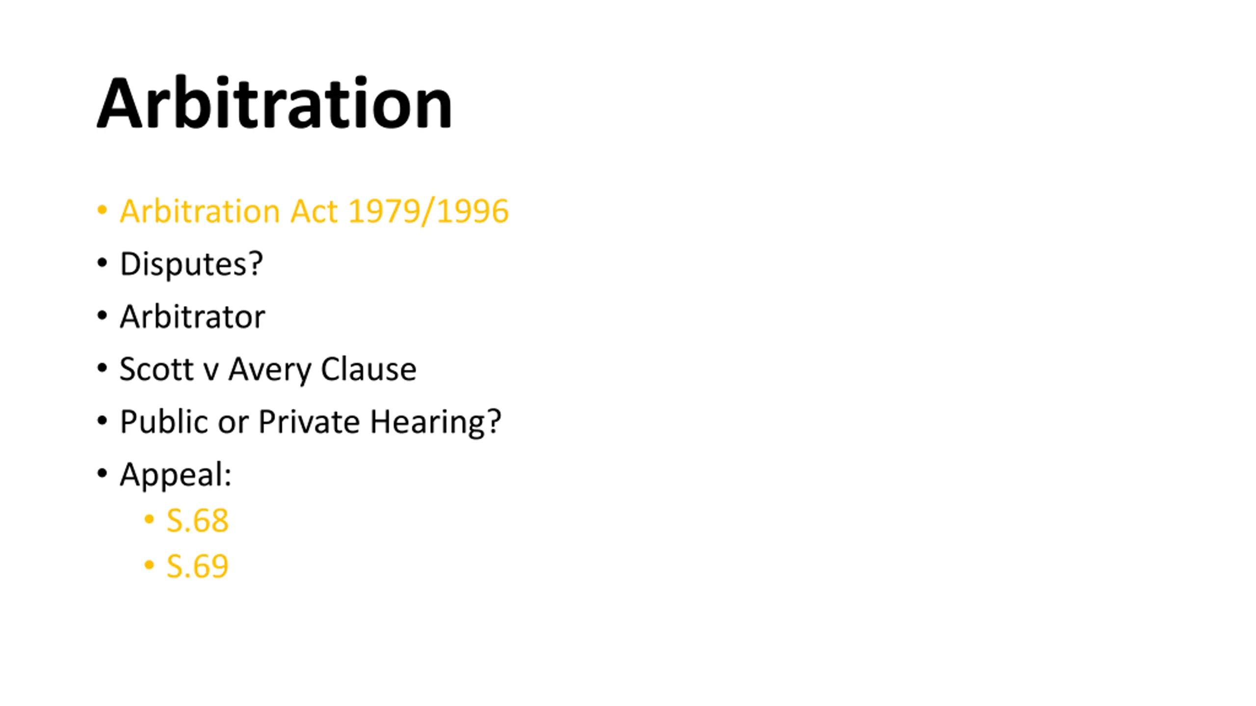 Arbitration Arbitration Act 1979/1996 Disputes? Arbitrator Scott v Avery Clause Public or Private Hearing? Appeal: S.68 S.69