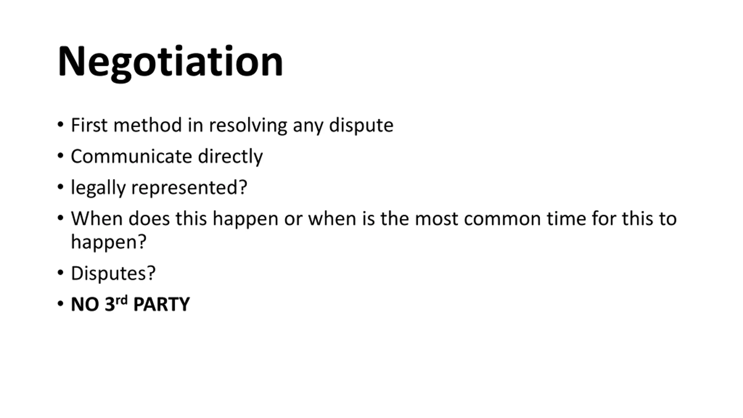 Negotiation First method in resolving any dispute Communicate directly legally represented? When does this happen or when is the most common time for this to happen? Disputes? NO 3rd PARTY