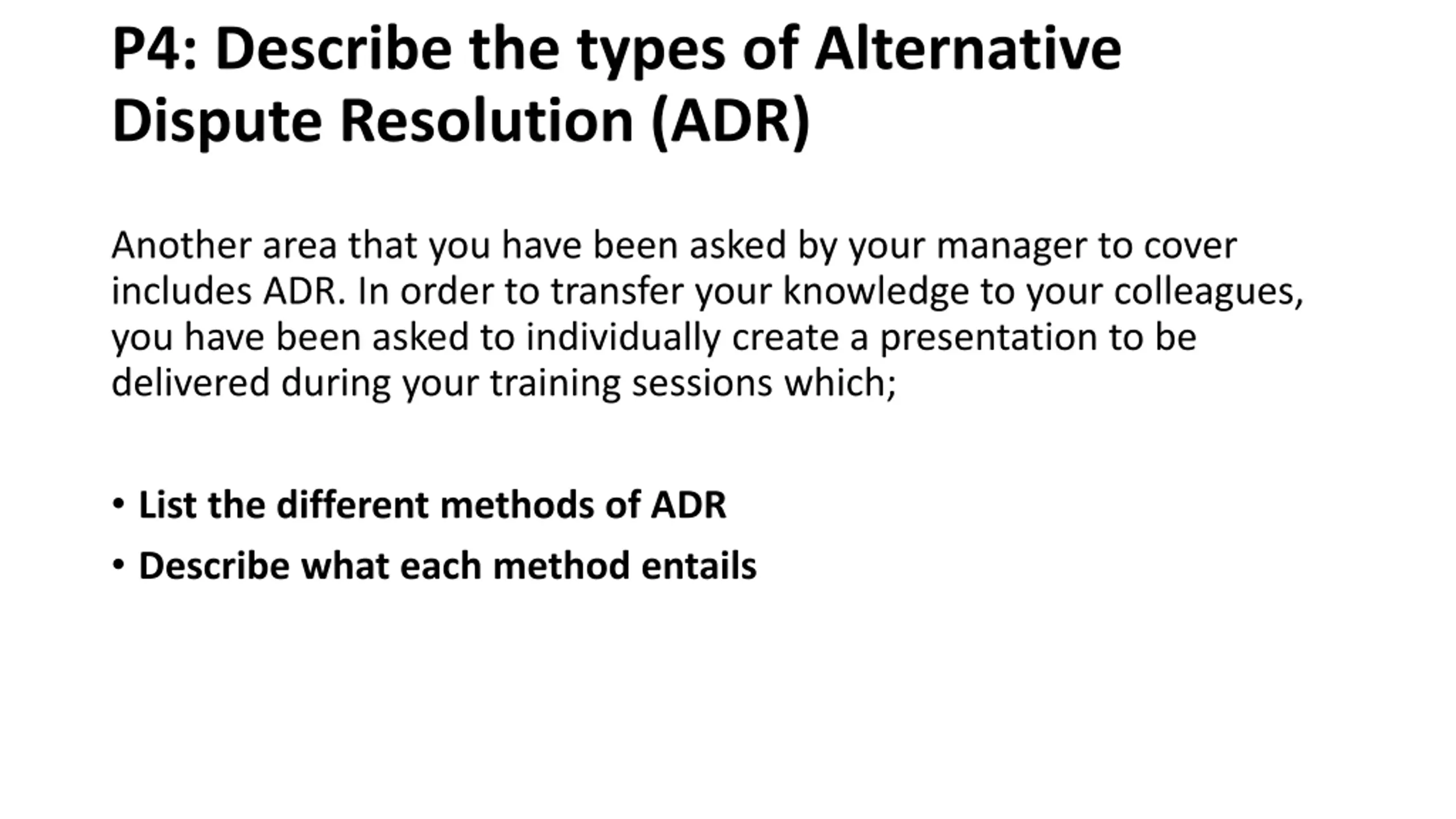 P4: Describe the types of Alternative Dispute Resolution (ADR) Another area that you have been asked by your manager to cover includes ADR. In order to transfer your knowledge to your colleagues, you have been asked to individually create a presentation to be delivered during your training sessions which; List the different methods of ADR Describe what each method entails