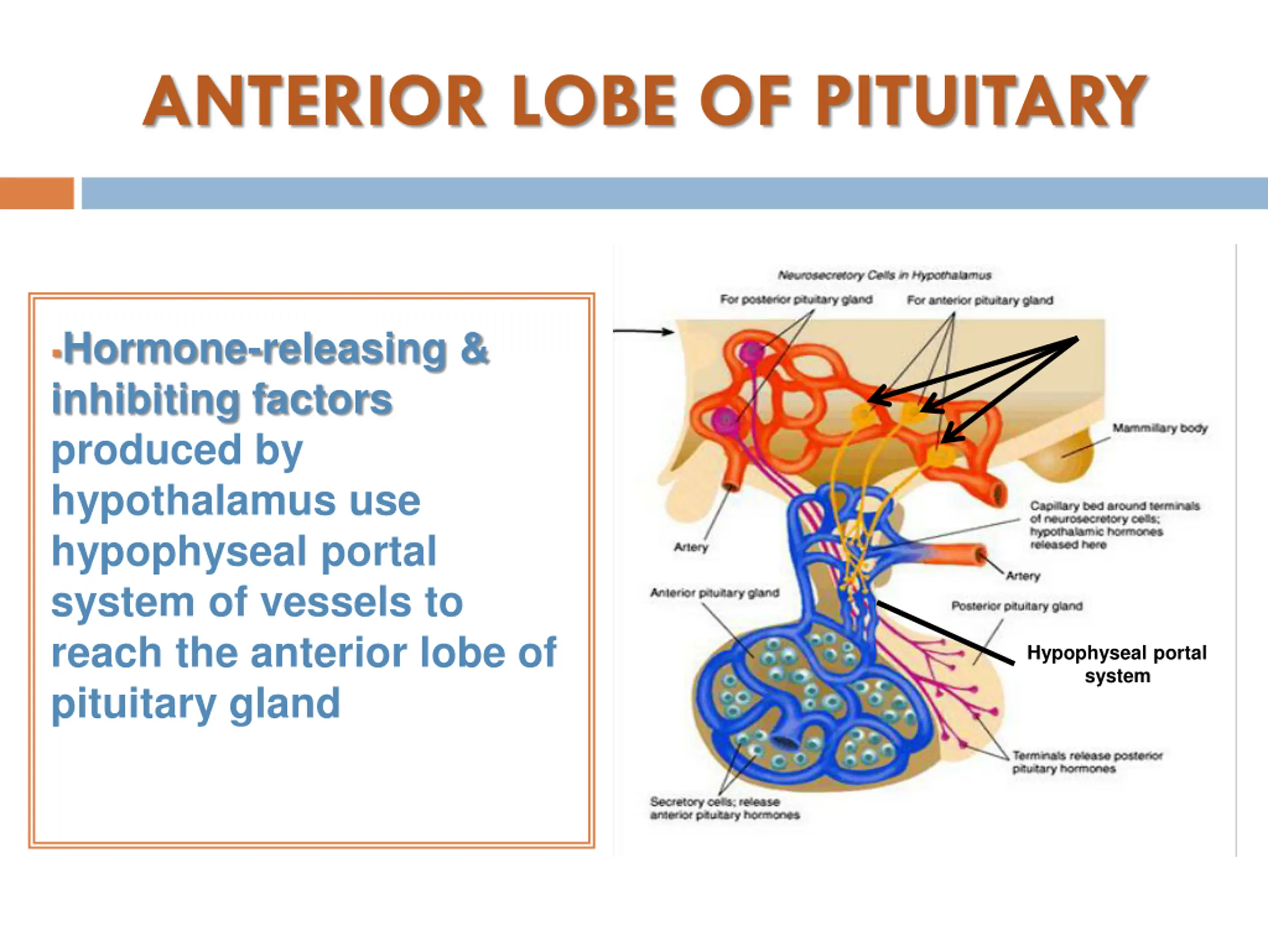 ANTERIOR LOBE OF PITUITARY Hormone-releasing & inhibiting factors produced by hypothalamus use hypophyseal portal system of vessels to reach the anterior lobe of pituitary gland Hypophyseal portal system