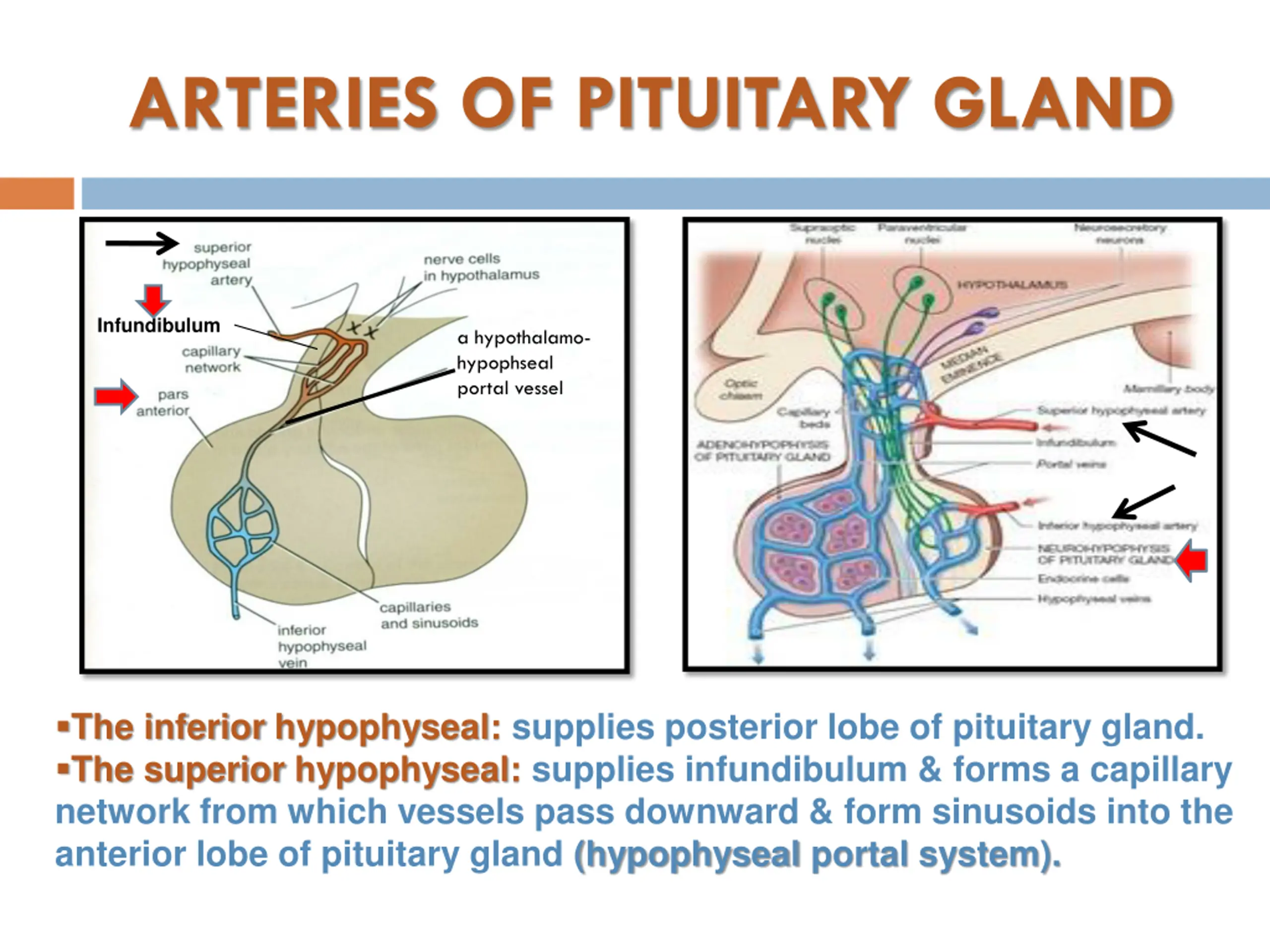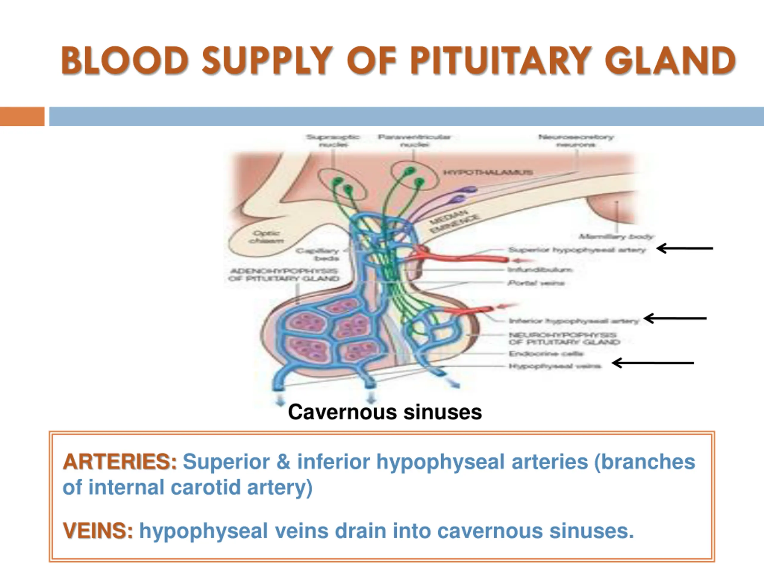 BLOOD SUPPLY OF PITUITARY GLAND Cavernous sinuses ARTERIES: Superior & inferior hypophyseal arteries (branches of internal carotid artery) VEINS: hypophyseal veins drain into cavernous sinuses.