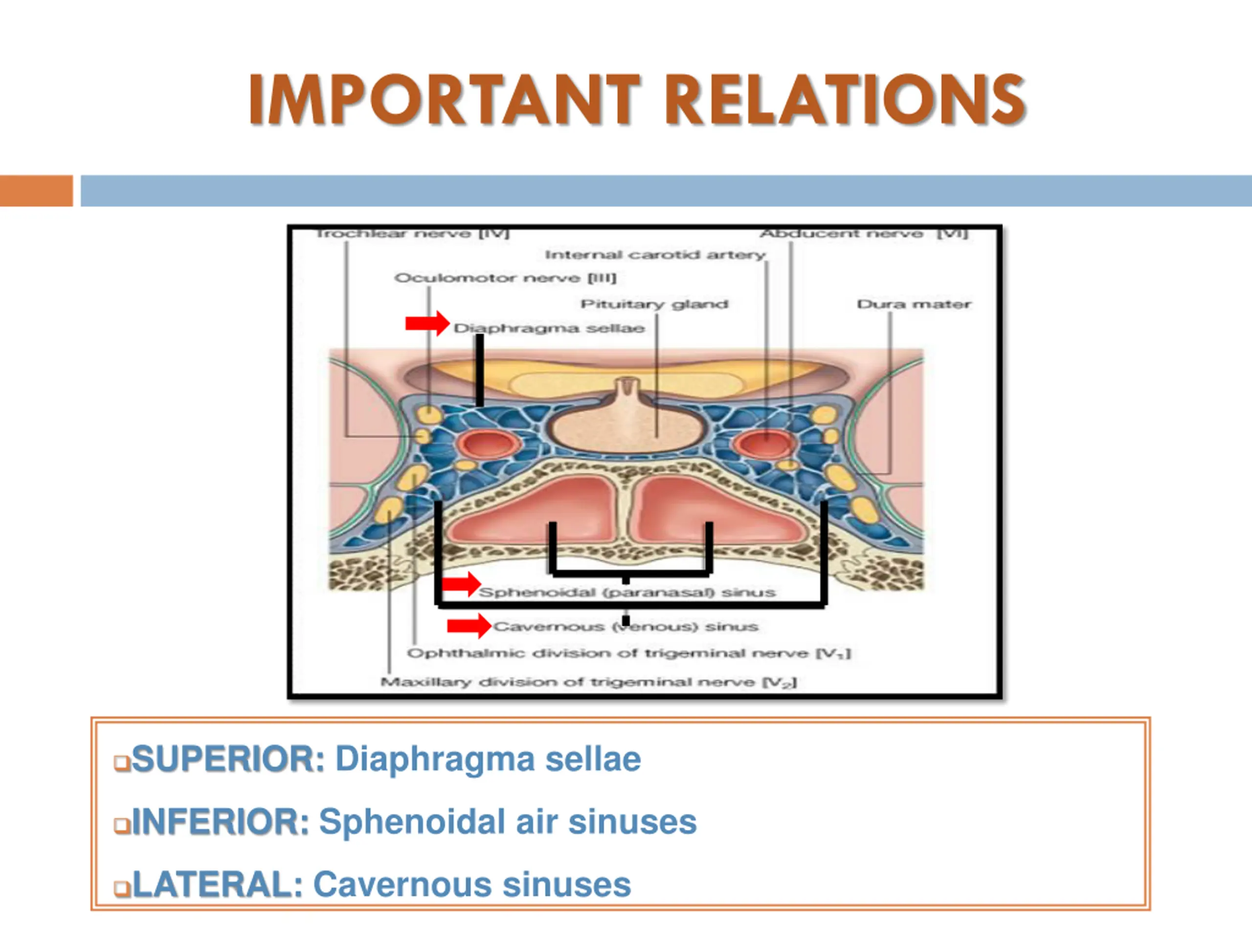 IMPORTANT RELATIONS SUPERIOR: Diaphragma sellae INFERIOR: Sphenoidal air sinuses LATERAL: Cavernous sinuses