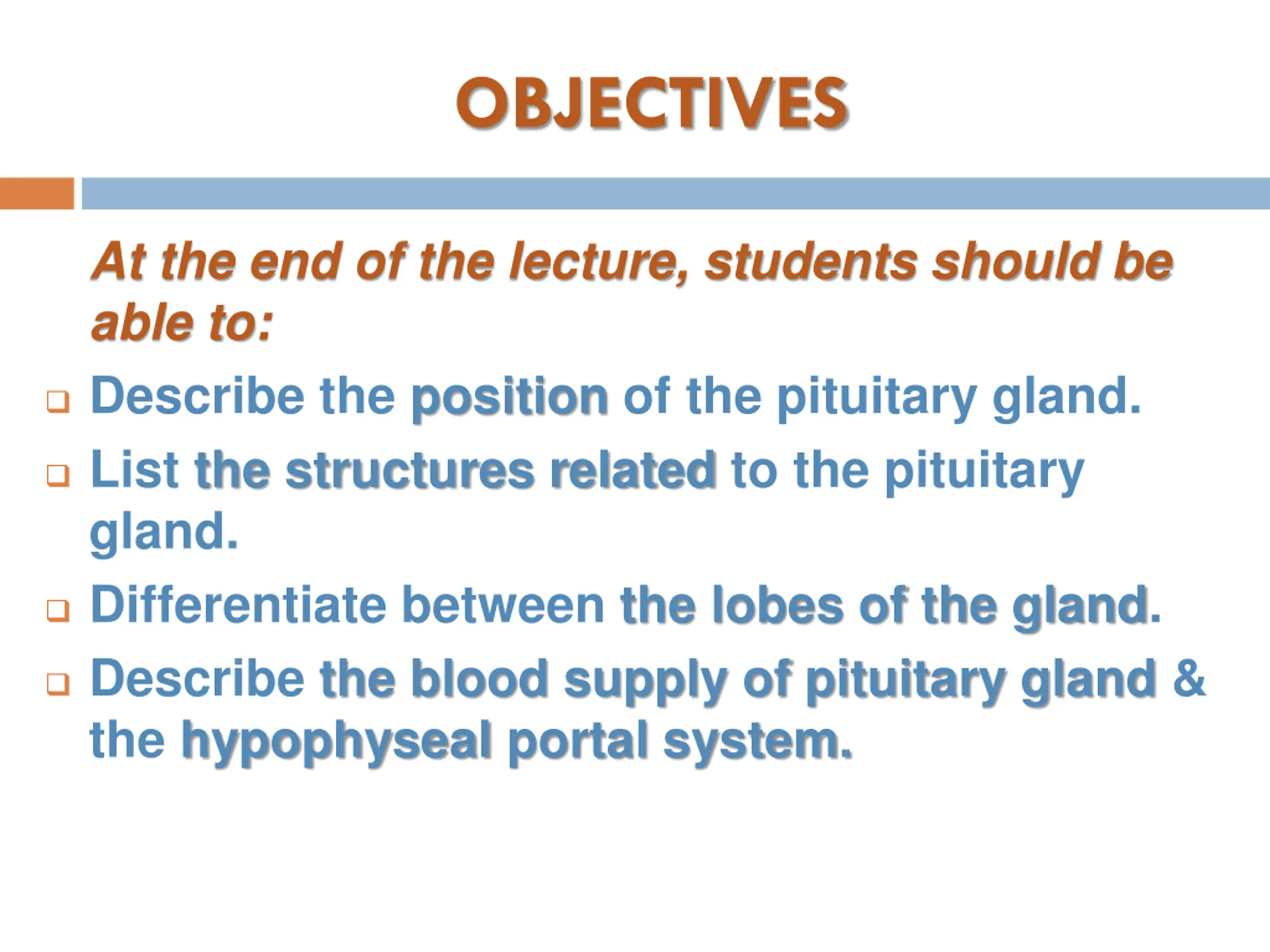 OBJECTIVES At the end of the lecture, students should be able to: Describe the position of the pituitary gland. List the structures related to the pituitary gland. Differentiate between the lobes of the gland. Describe the blood supply of pituitary gland & the hypophyseal portal system.