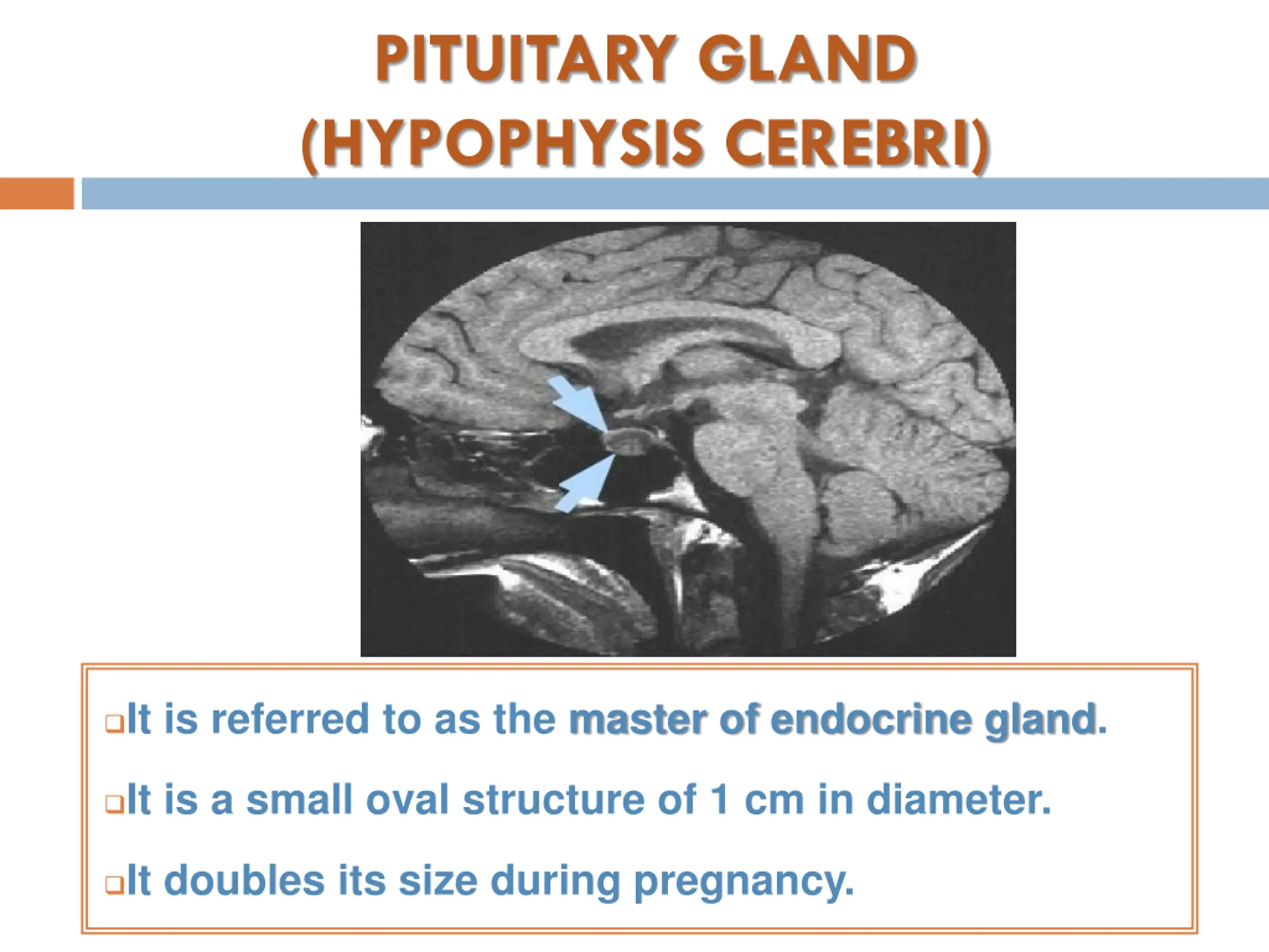 PITUITARY GLAND (HYPOPHYSIS CEREBRI) It is referred to as the master of endocrine gland. It is a small oval structure of 1 cm in diameter. It doubles its size during pregnancy.
