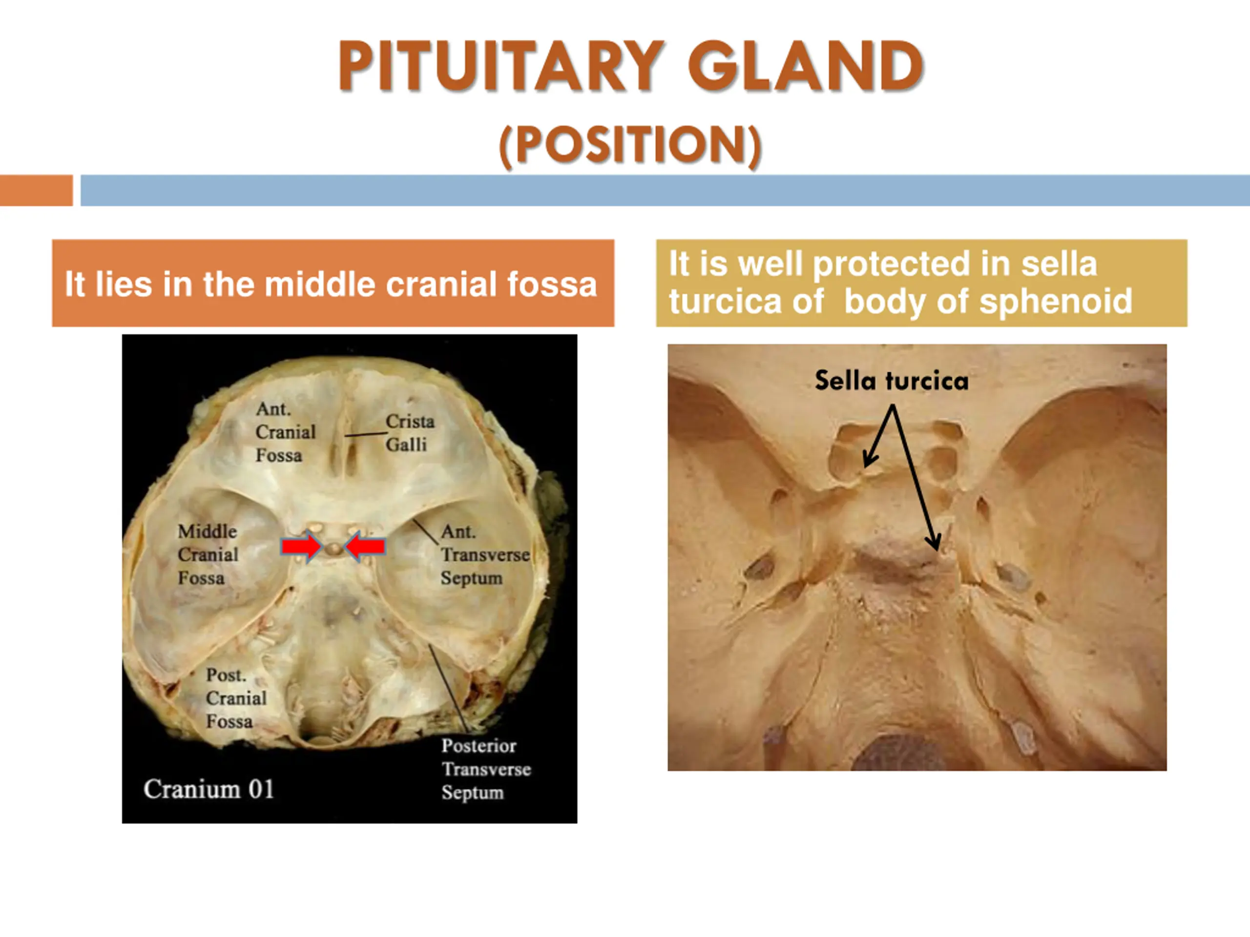 PITUITARY GLAND (POSITION) It is well protected in sella turcica of body of sphenoid It lies in the middle cranial fossa Sella turcica