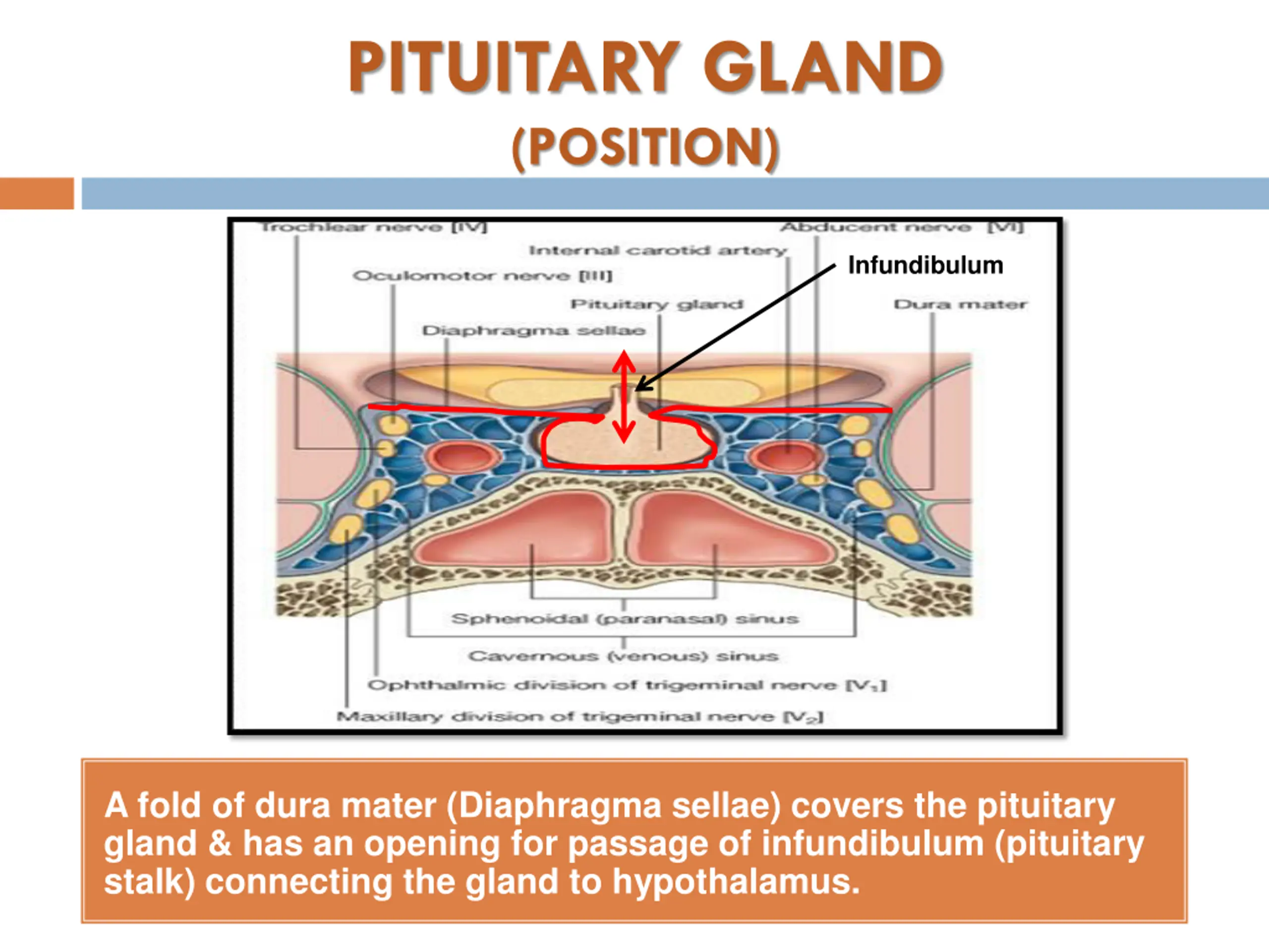 PITUITARY GLAND (POSITION) Infundibulum A fold of dura mater (Diaphragma sellae) covers the pituitary gland & has an opening for passage of infundibulum (pituitary stalk) connecting the gland to hypothalamus.