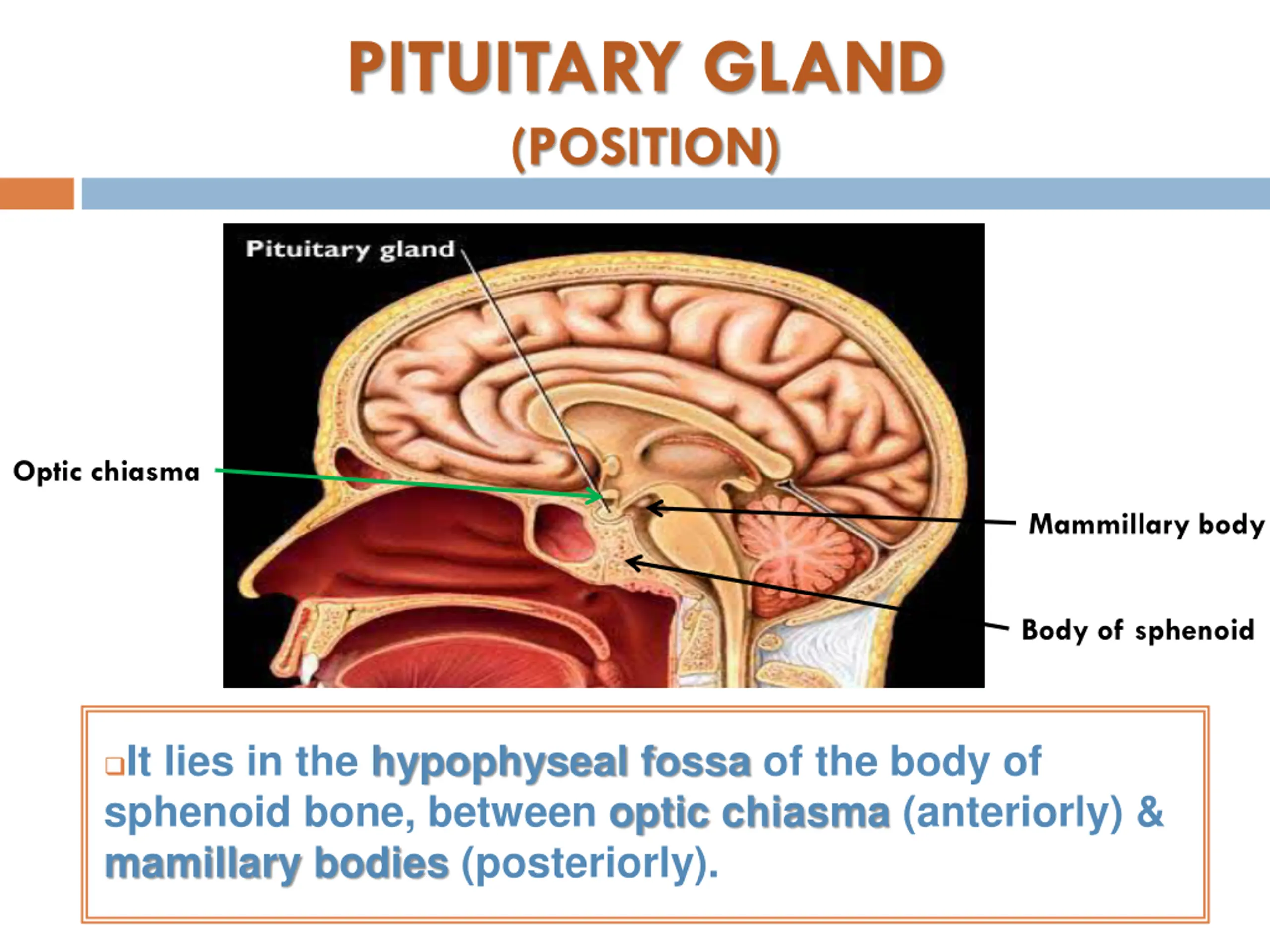 PITUITARY GLAND (POSITION) Optic chiasma Mammillary body Body of sphenoid It lies in the hypophyseal fossa of the body of sphenoid bone, between optic chiasma (anteriorly) & mamillary bodies (posteriorly).
