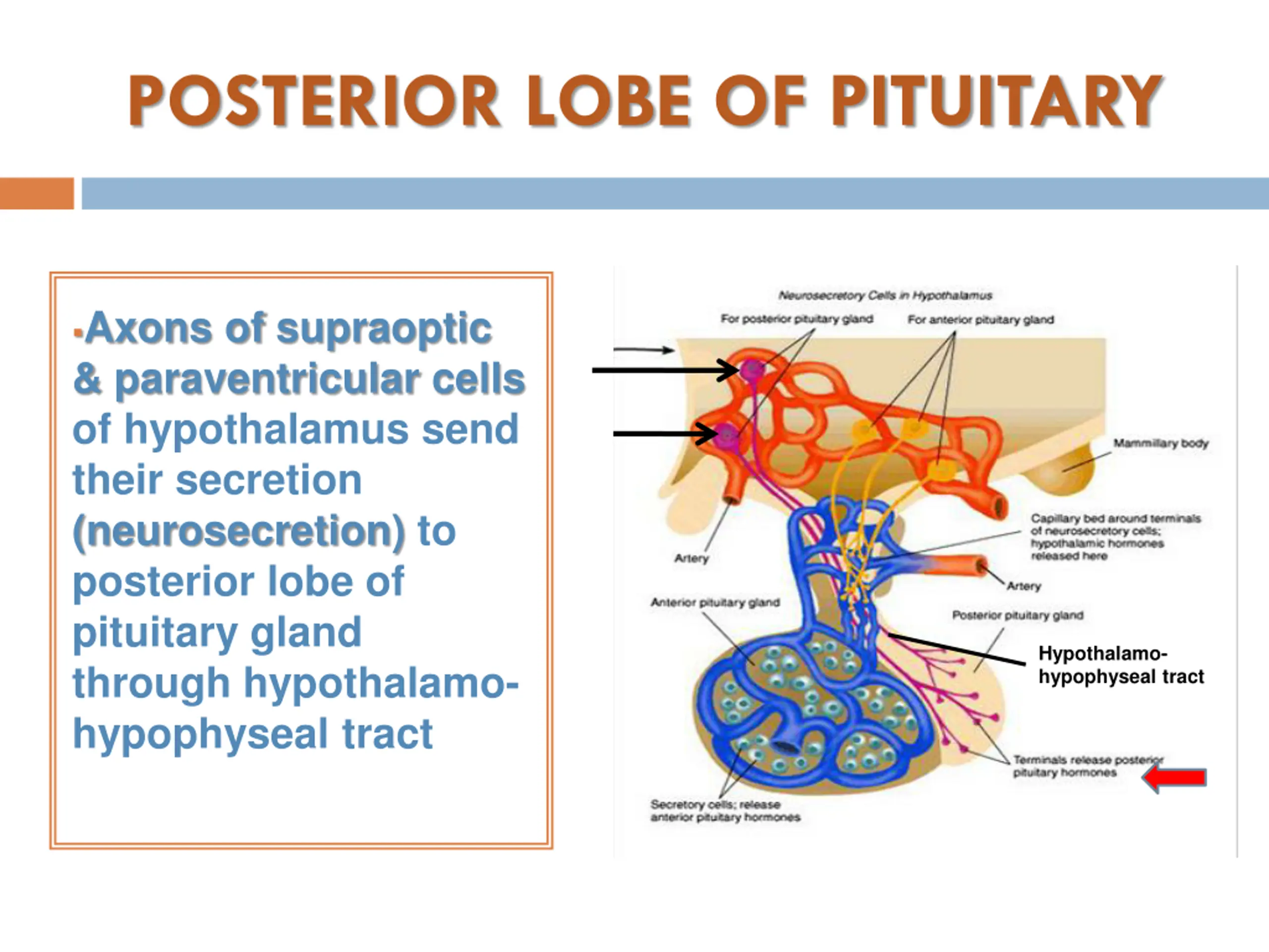 POSTERIOR LOBE OF PITUITARY Axons of supraoptic & paraventricular cells of hypothalamus send their secretion (neurosecretion) to posterior lobe of pituitary gland through hypothalamo- hypophyseal tract Hypothalamo- hypophyseal tract