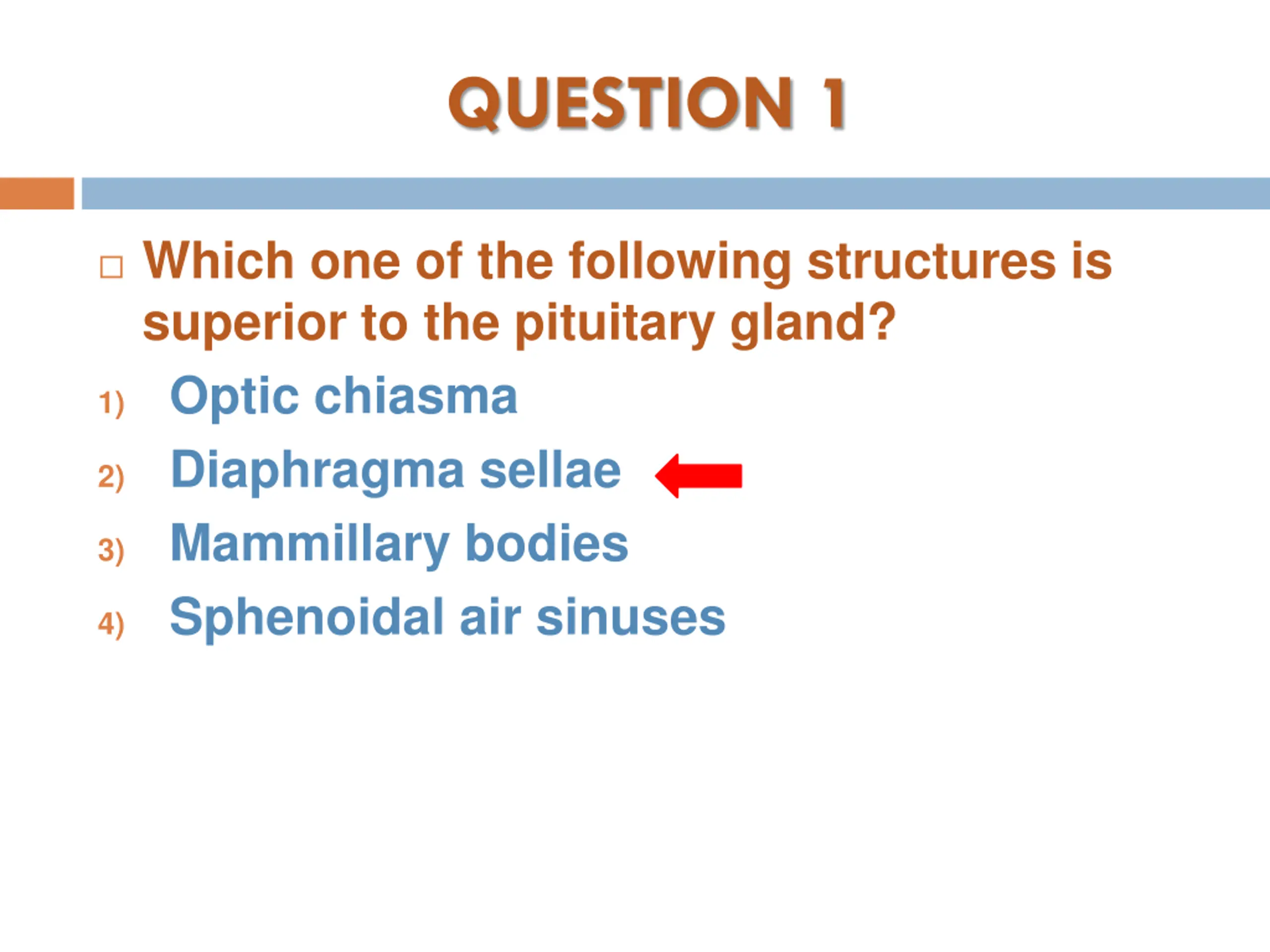 QUESTION 1 Which one of the following structures is superior to the pituitary gland? 1) Optic chiasma 2) Diaphragma sellae 3) Mammillary bodies 4) Sphenoidal air sinuses