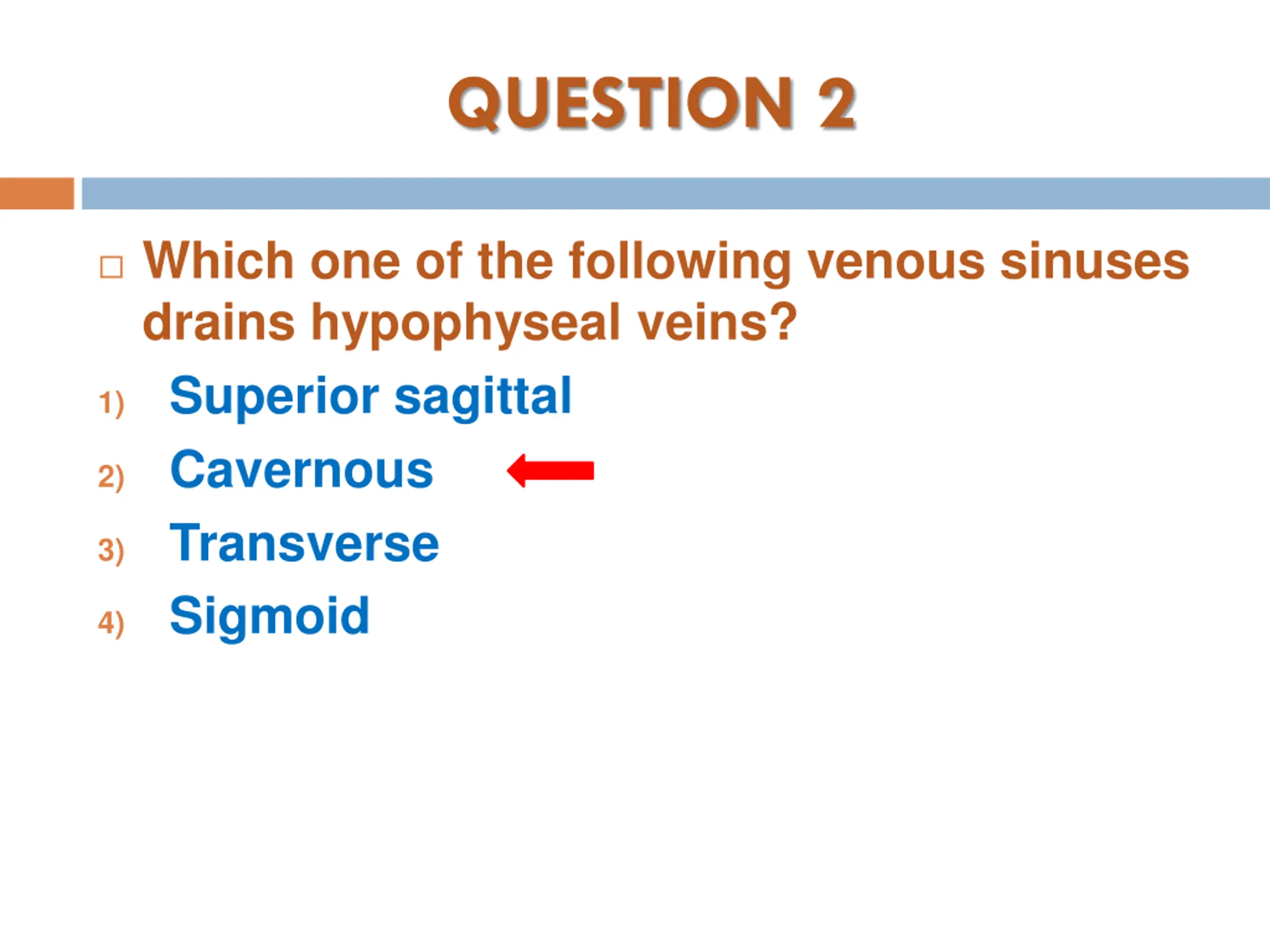 QUESTION 2 Which one of the following venous sinuses drains hypophyseal veins? 1) Superior sagittal 2) Cavernous 3) Transverse 4) Sigmoid