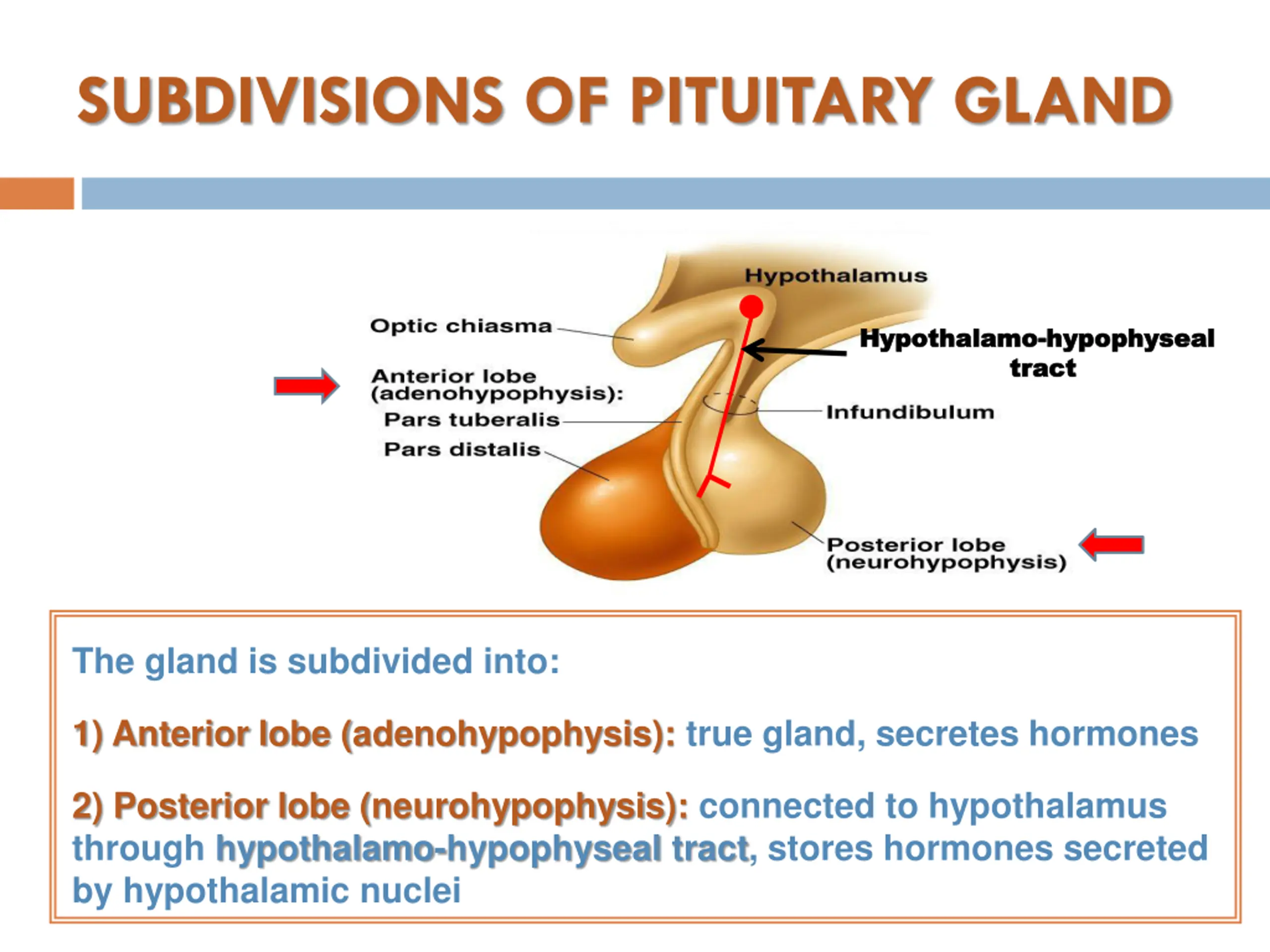 SUBDIVISIONS OF PITUITARY GLAND Hypothalamo Hypothalamo- -hypophyseal tract tract hypophyseal The gland is subdivided into: 1) Anterior lobe (adenohypophysis): true gland, secretes hormones 2) Posterior lobe (neurohypophysis): connected to hypothalamus through hypothalamo-hypophyseal tract, stores hormones secreted by hypothalamic nuclei