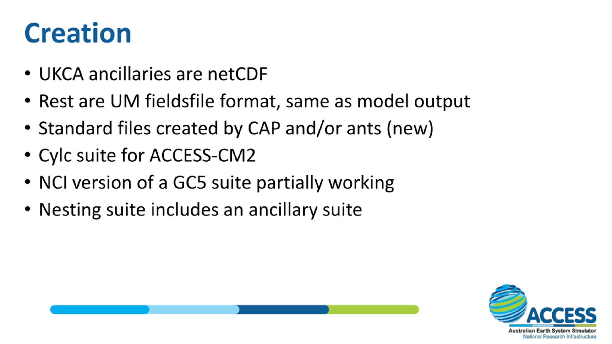Creation UKCA ancillaries are netCDF Rest are UM fieldsfile format, same as model output Standard files created by CAP and/or ants (new) Cylc suite for ACCESS-CM2 NCI version of a GC5 suite partially working Nesting suite includes an ancillary suite 3 |