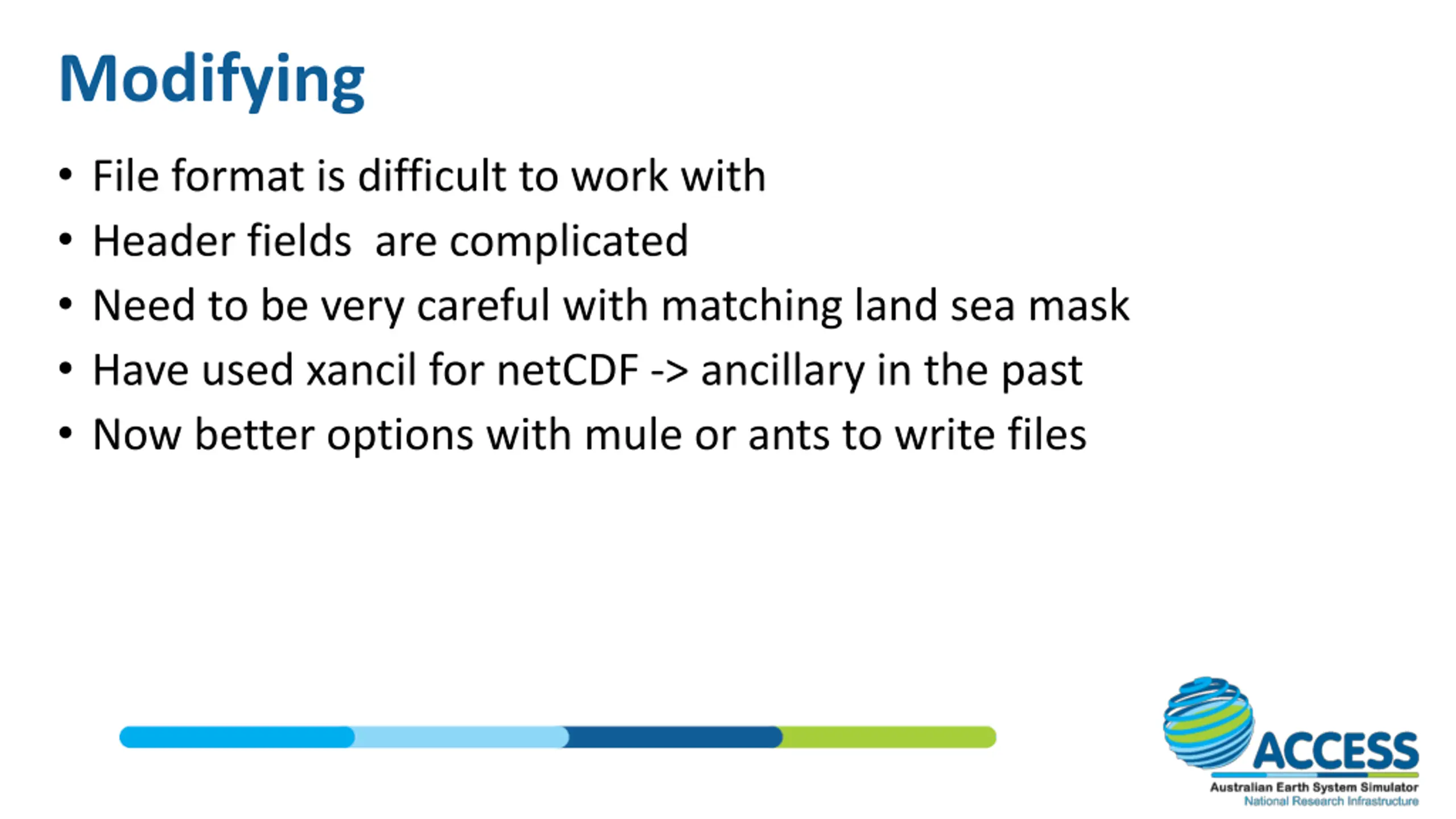 Modifying File format is difficult to work with Header fields are complicated Need to be very careful with matching land sea mask Have used xancil for netCDF -> ancillary in the past Now better options with mule or ants to write files 8 |