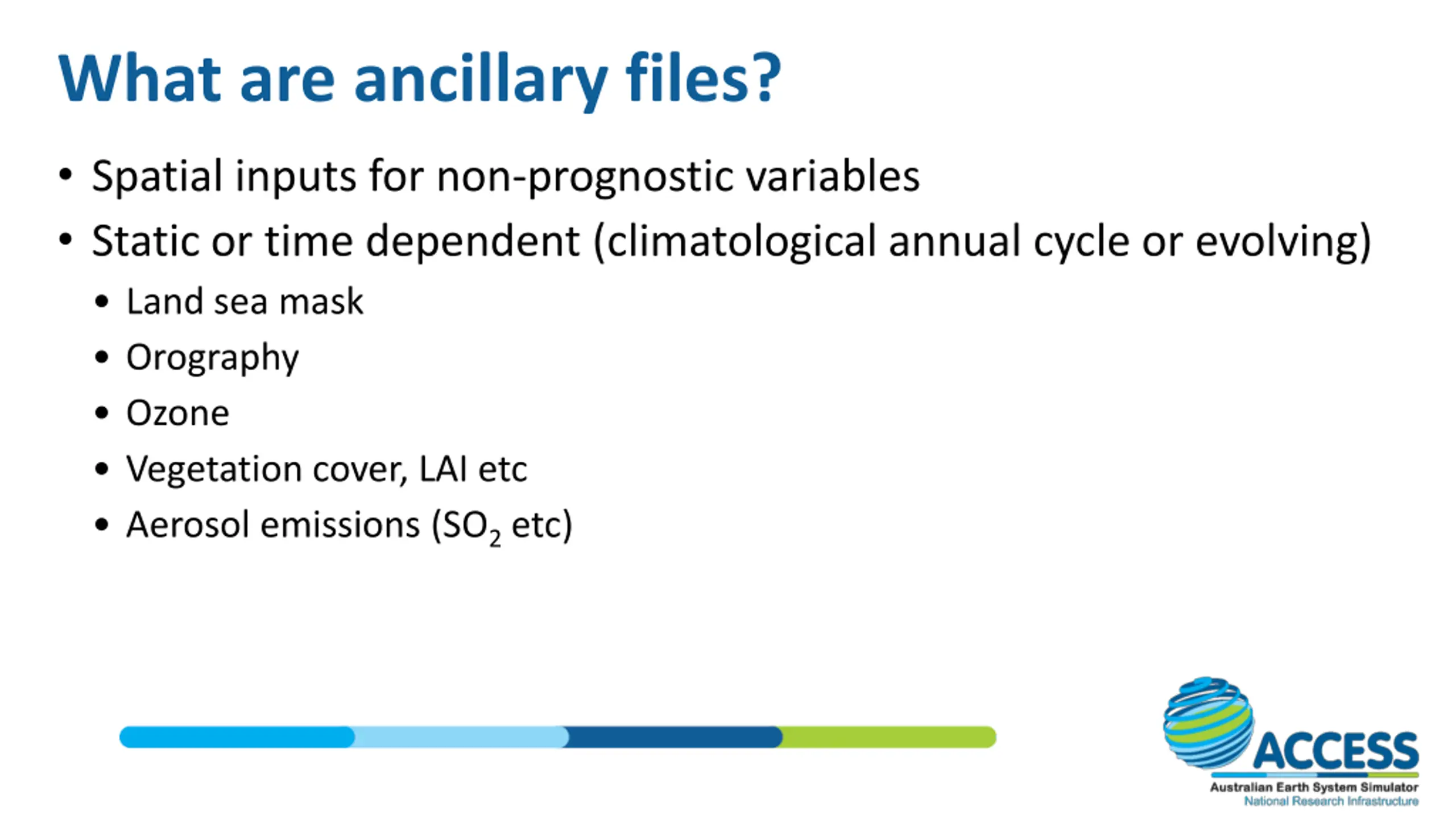 What are ancillary files? Spatial inputs for non-prognostic variables Static or time dependent (climatological annual cycle or evolving) Land sea mask Orography Ozone Vegetation cover, LAI etc Aerosol emissions (SO2etc) 2 |